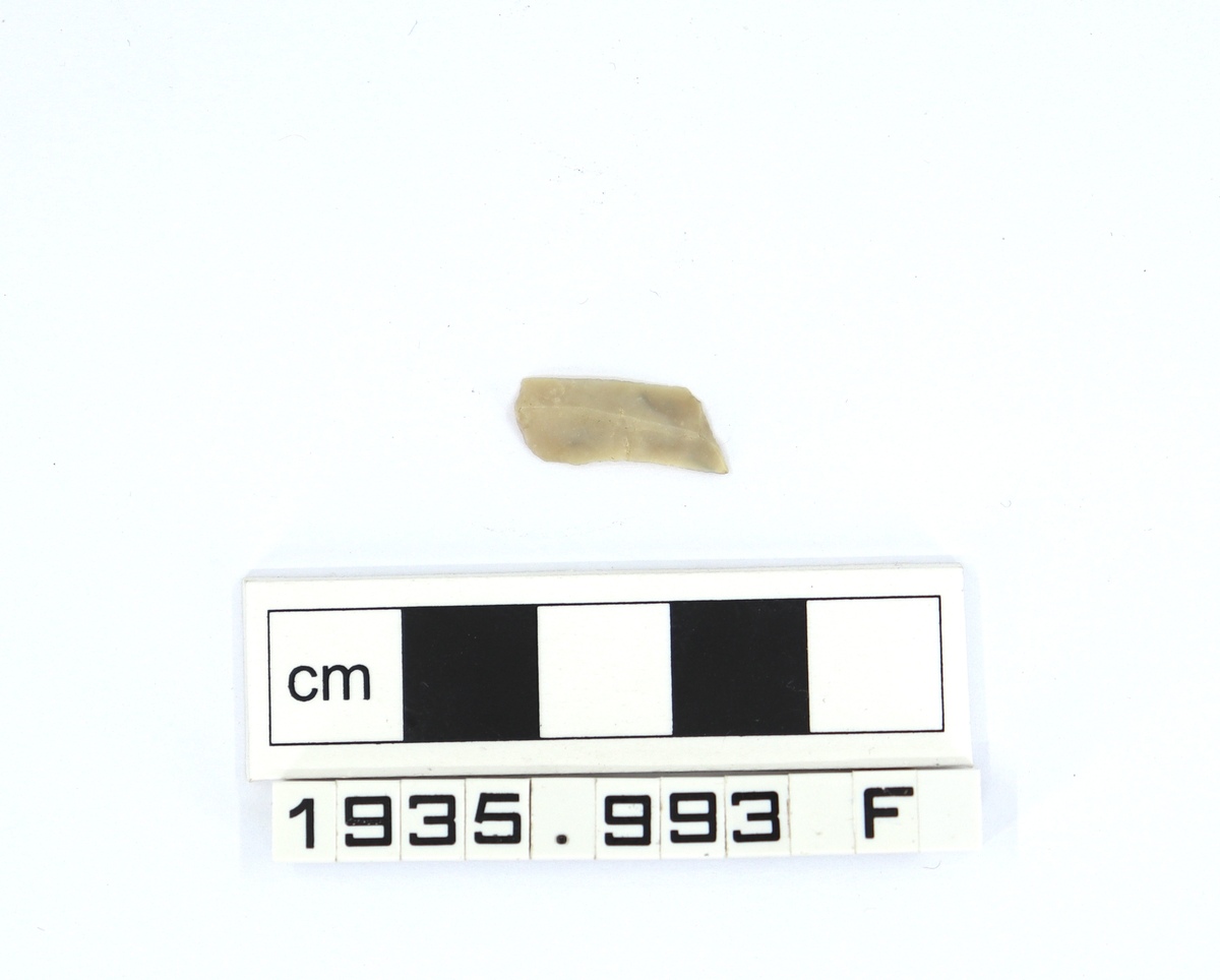 Description for 1935.993 A-N: '14 flint implements : A, B, C, H: Tranchets; D, E, F, G, I, J, K, L, N: Backed blades; M: Burin'