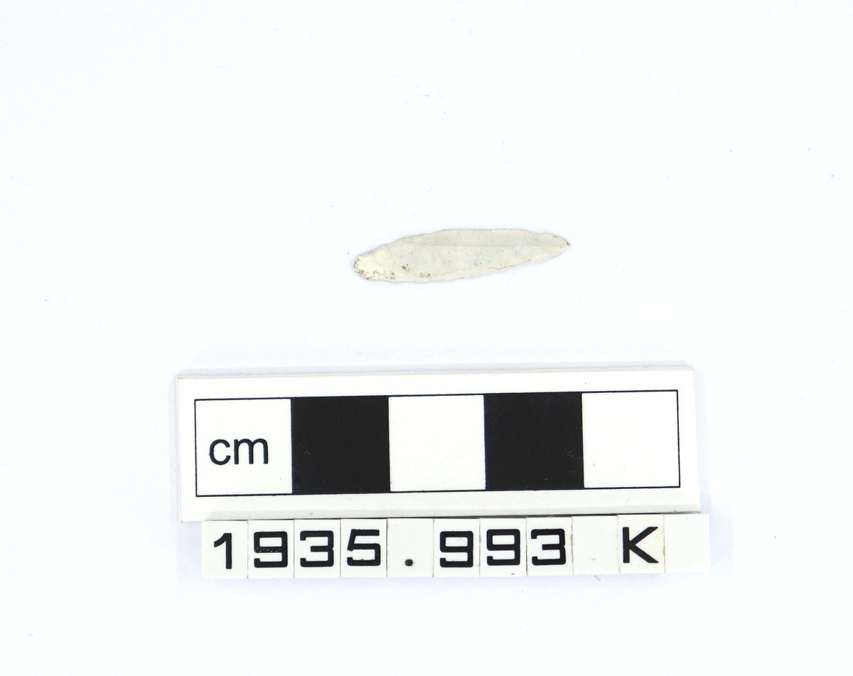 Description for 1935.993 A-N: '14 flint implements : A, B, C, H: Tranchets; D, E, F, G, I, J, K, L, N: Backed blades; M: Burin'