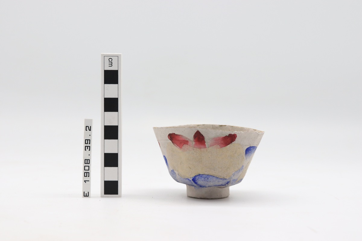 On display in the China case (64), Maudslay Hall, from 1990 onwards. Display label reads, '10 Zhi Zha Ji Pin (funerary objects) / These items (paper cloth, money, shoes and a lidded cup) are burnt at a funeral so that the deceased may have the use of the articles they represent in the other world.'