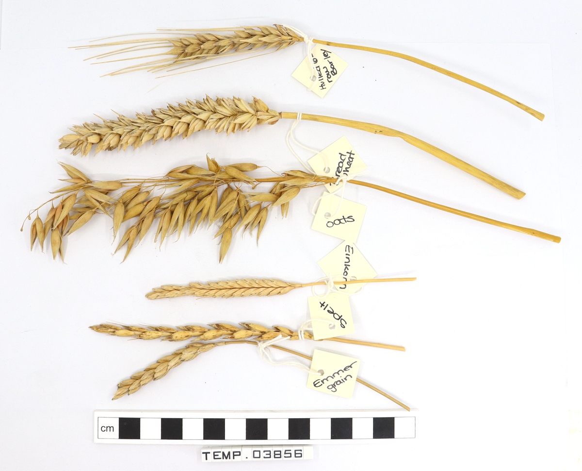 Types of cereals used by early farmers. Spelt, oats, einkorn, bread wheat, 6-row barley, emmer.
