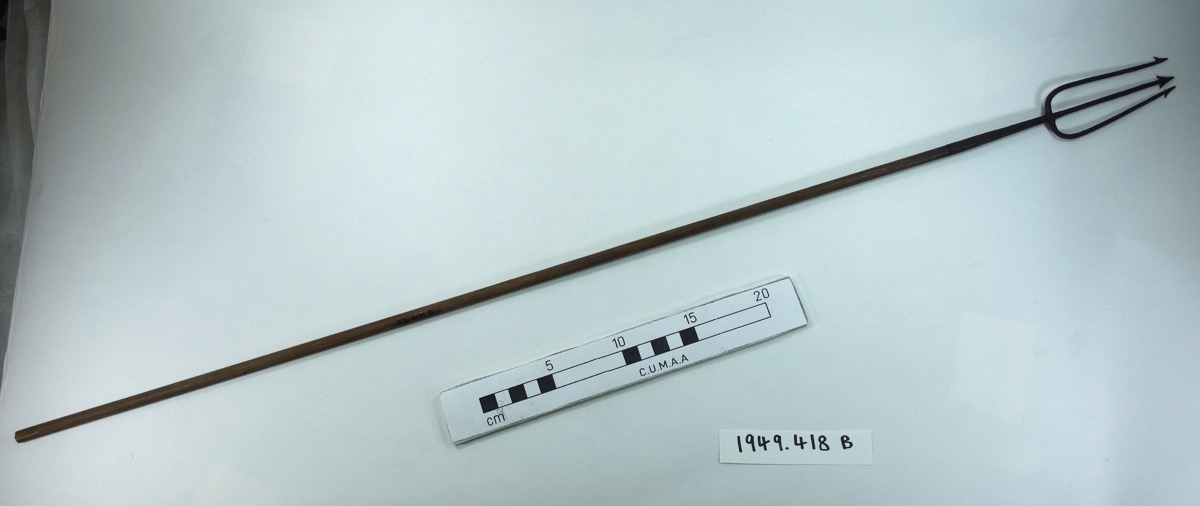 Iron-headed fish arrows, with no feathering. A) harpoon head and single barb. B) trident head. C) solid quadrangular head.