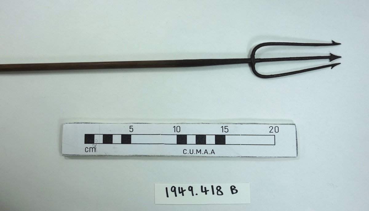 Three iron-headed fish arrows, with no feathering. A) harpoon head and single barb. B) trident head. C) solid quadrangular head.
