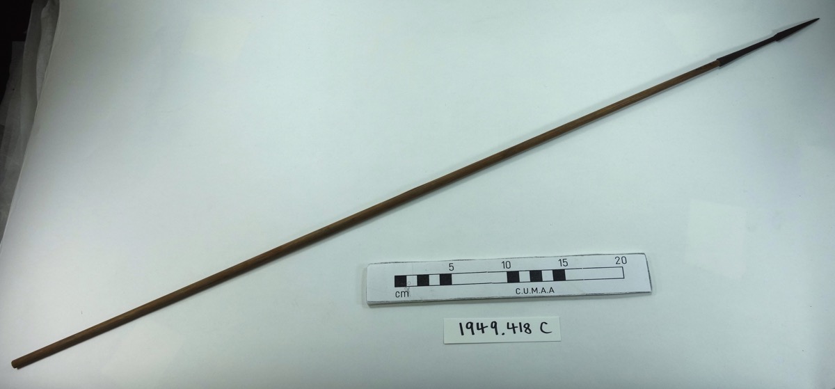 Three iron-headed fish arrows, with no feathering. A) harpoon head and single barb. B) trident head. C) solid quadrangular head.