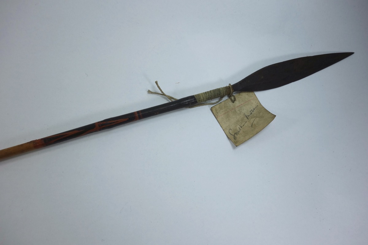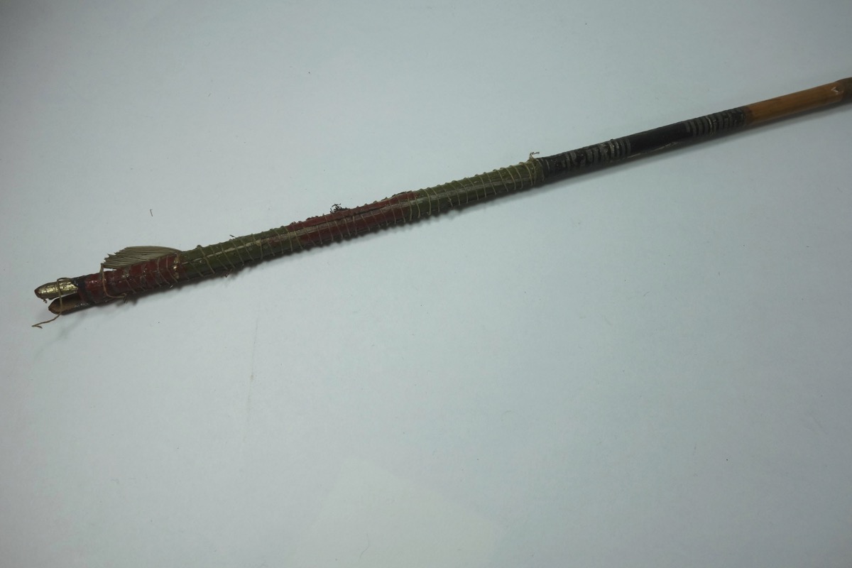 Crudely-painted arrow of bamboo with heavy, leaf-shaped points of metal. Labelled " South India" .