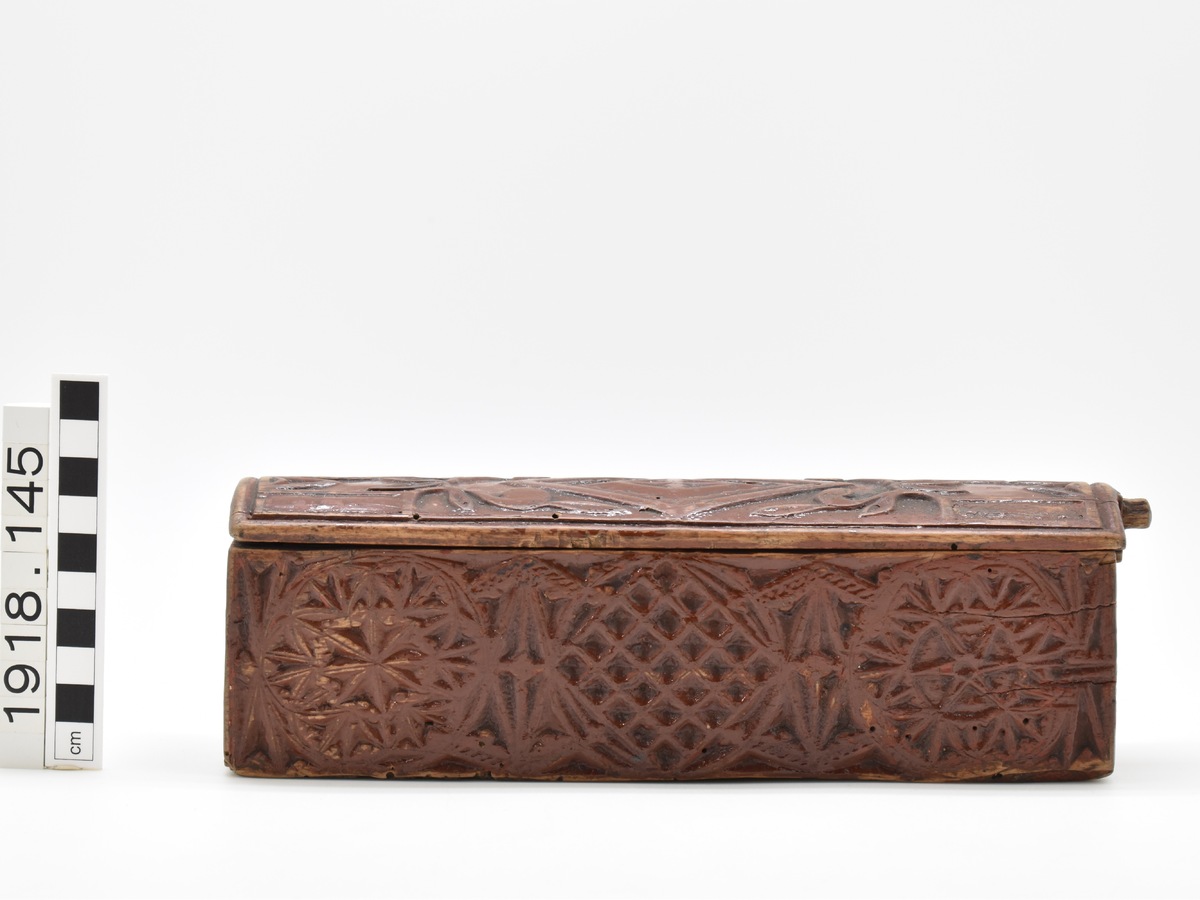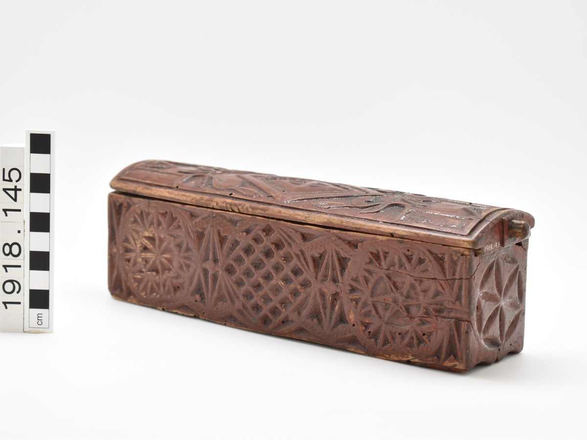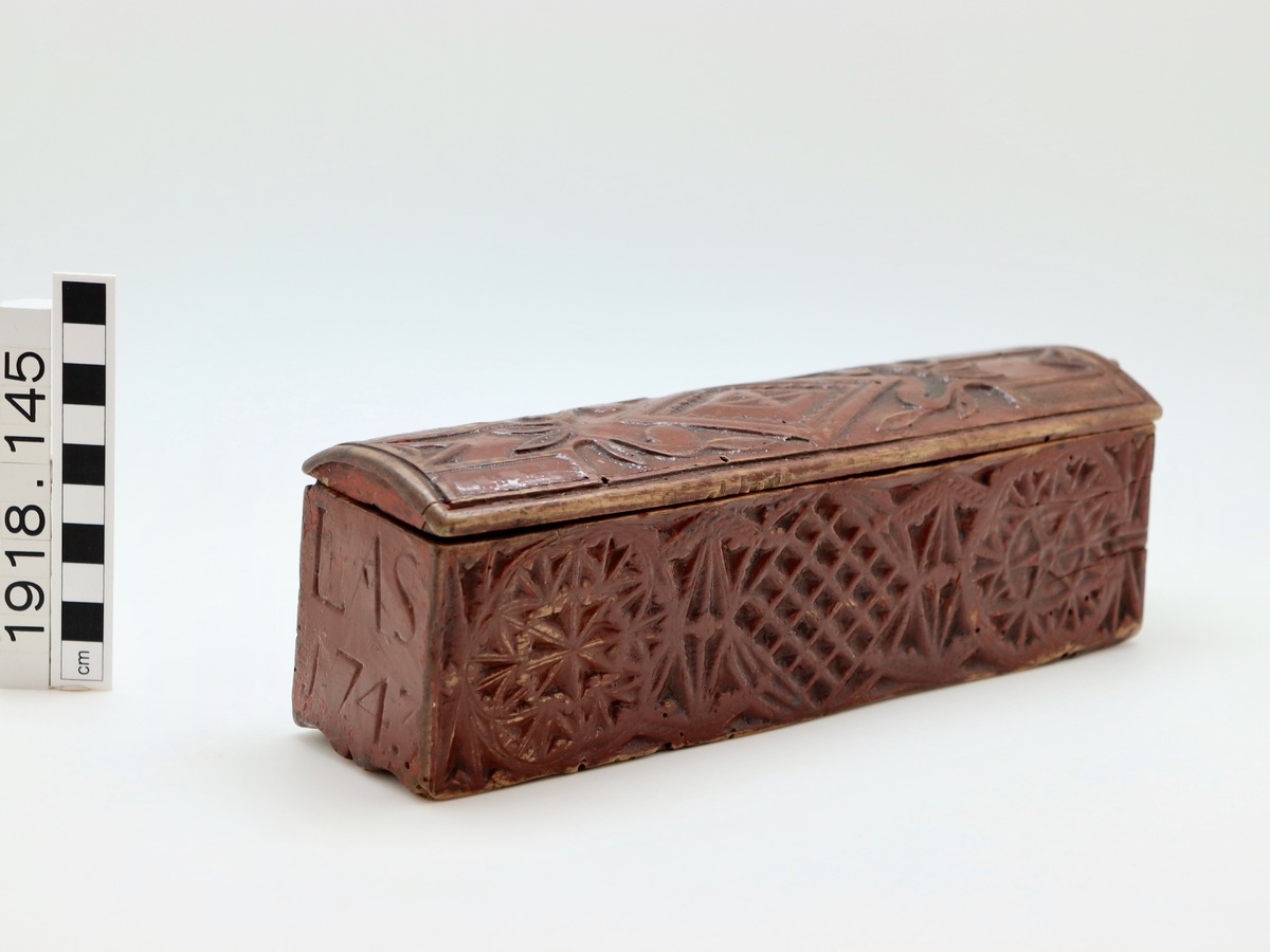 Oblong box with sliding lid, possibly a pencil case. It is carved with geometric patterns on all sides. One of the sides is carved with '1743 L.A.S.'. The lid is convex and incised with 'I.B.' on the underside, and other less legible letters.