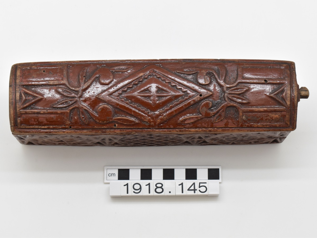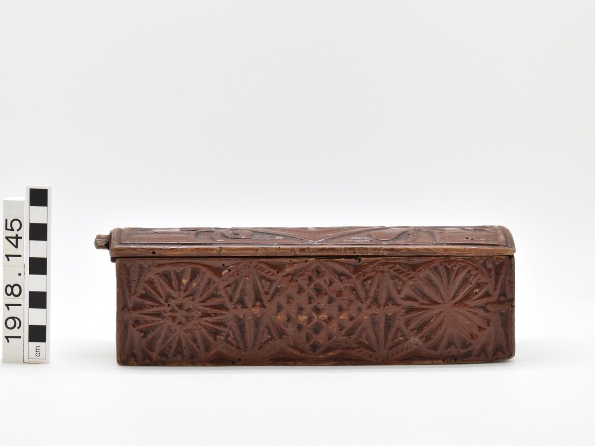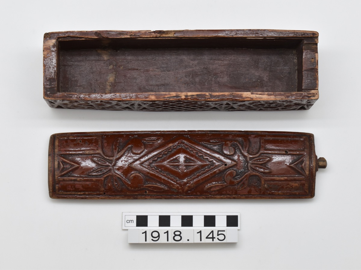 Oblong box with sliding lid, possibly a pencil case. It is carved with geometric patterns on all sides. One of the sides is carved with '1743 L.A.S.'. The lid is convex and incised with 'I.B.' on the underside, and other less legible letters.