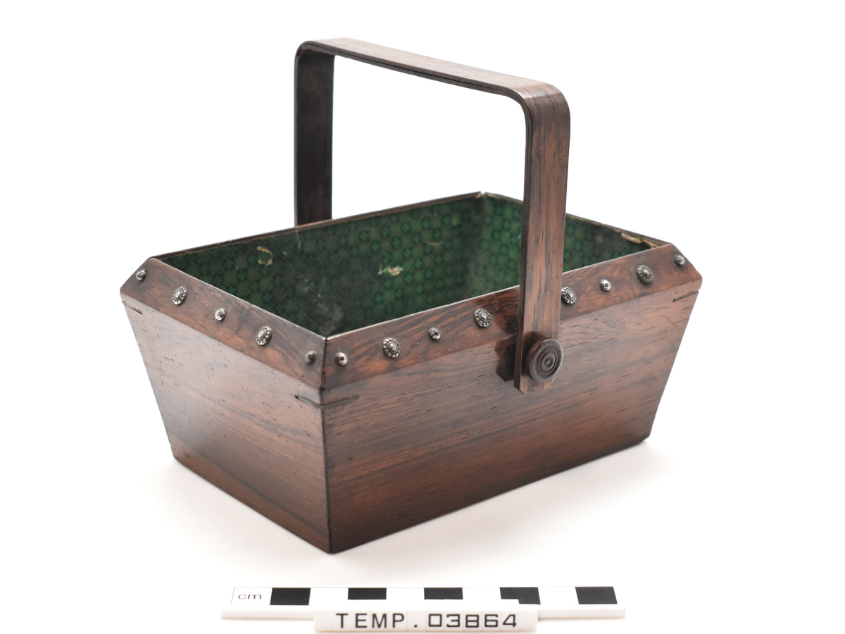 Rectangular wooden box resembling a basket with a handle attached with wooden dowels. Upper rim of box is decorated with round metal studs and the inside lined with green quatrefoil pattern paper. The same paper has been used to cover the underside of the box.