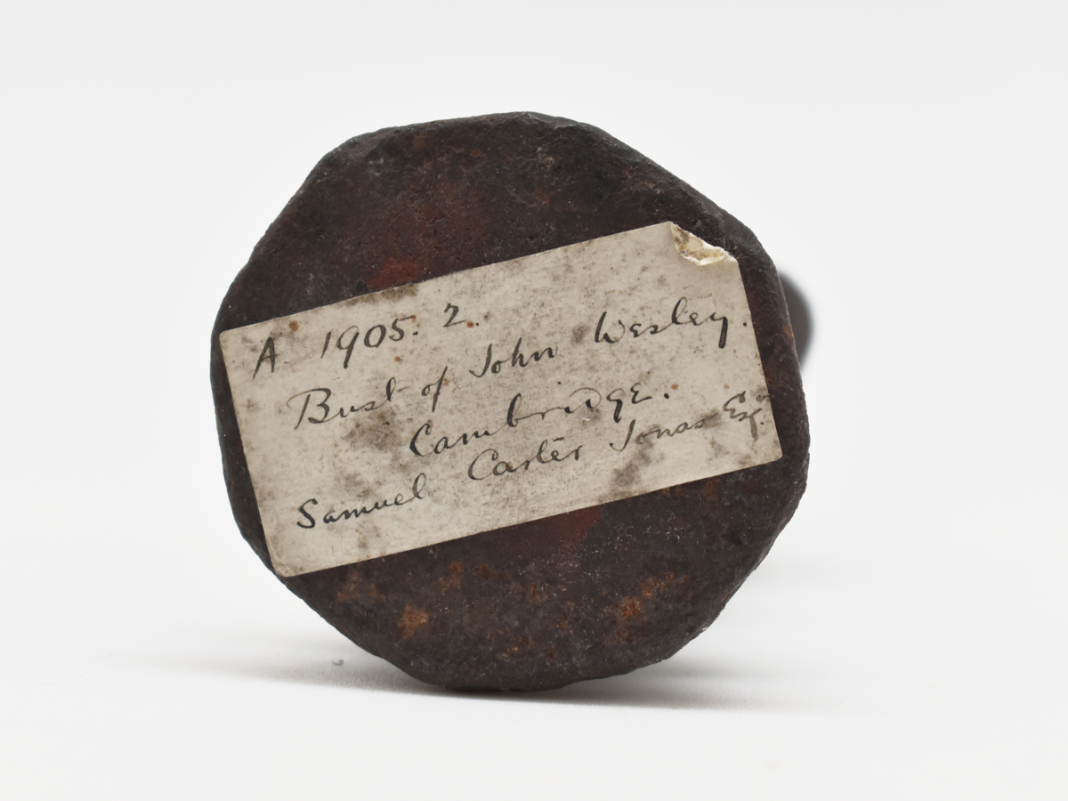 Label glued to the base reads: 'A 1905.2. Bust of John Wesley. Cambridge. Samuel Carter Jonas Esq.'