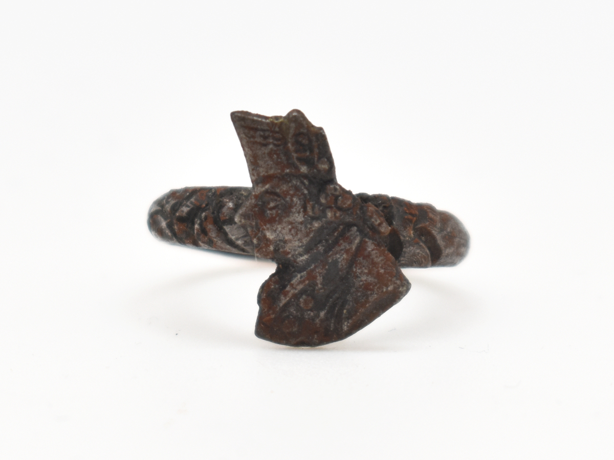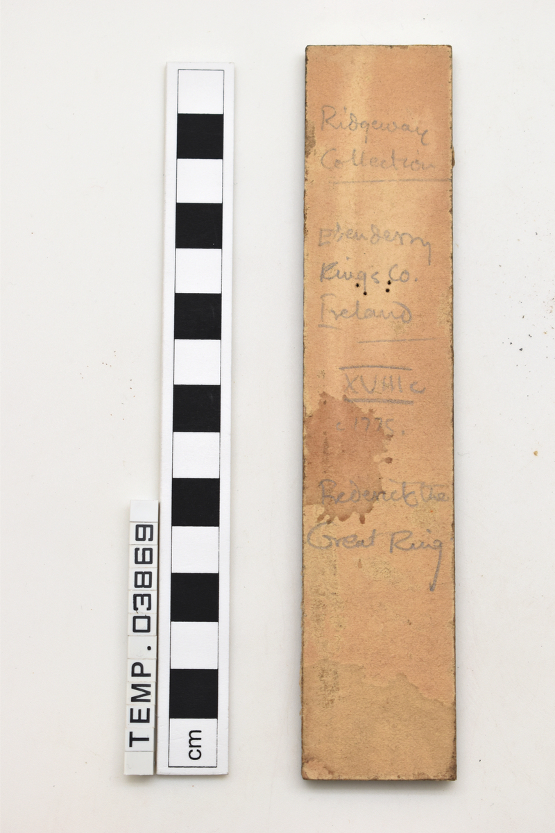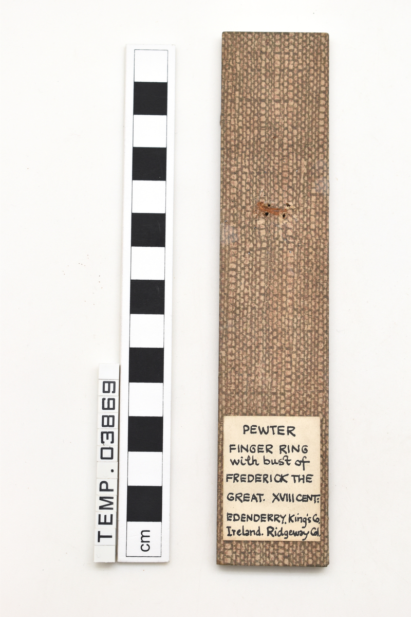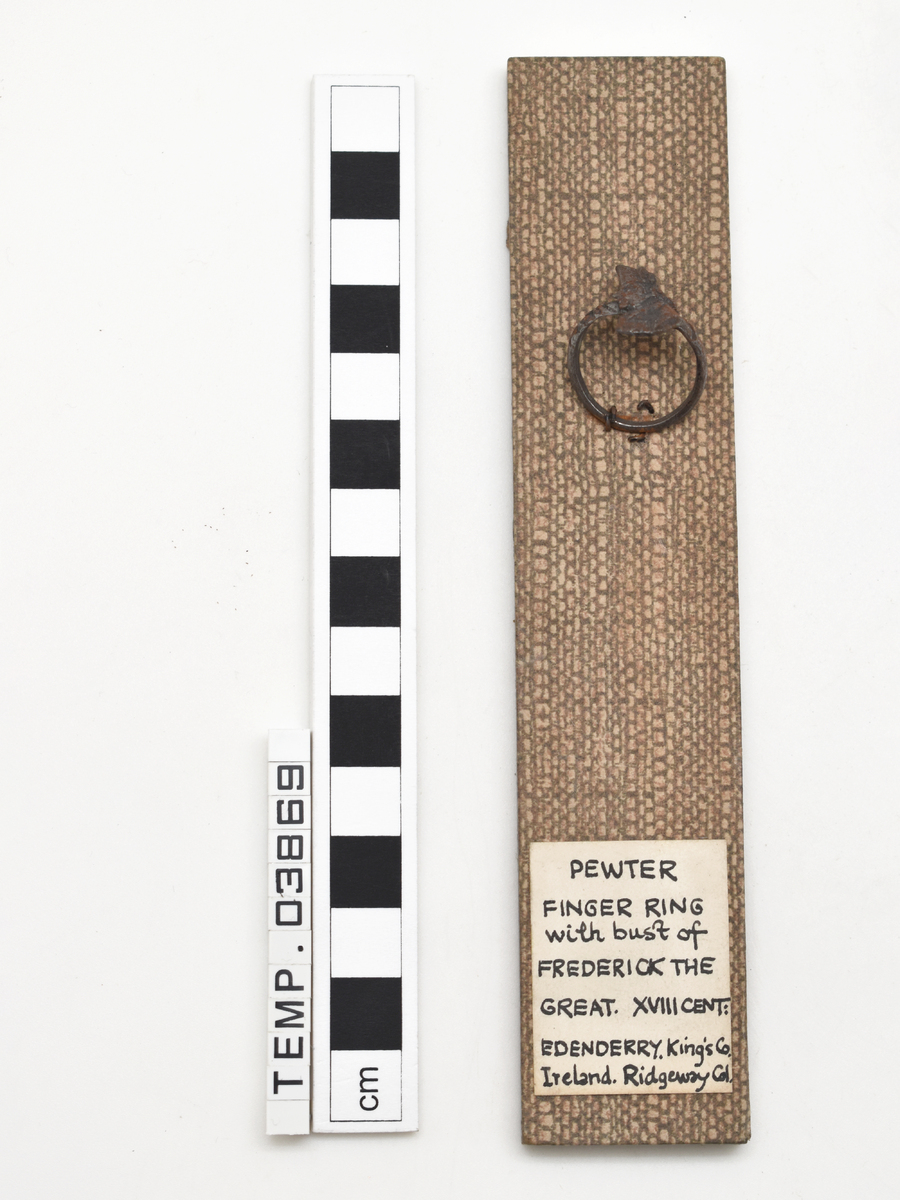 Historic mounts bears the following label: Pewter finger ring with bust of Frederick the Great. XVIII cent. Edenderry. King's Co. Ireland. Ridgeway Col.' Several notes were made in pencil on the back: 'Ridgeway Collection / Edenderry Kings Co. Ireland / XVIIIc c.1775. / Frederick the Great Ring'.