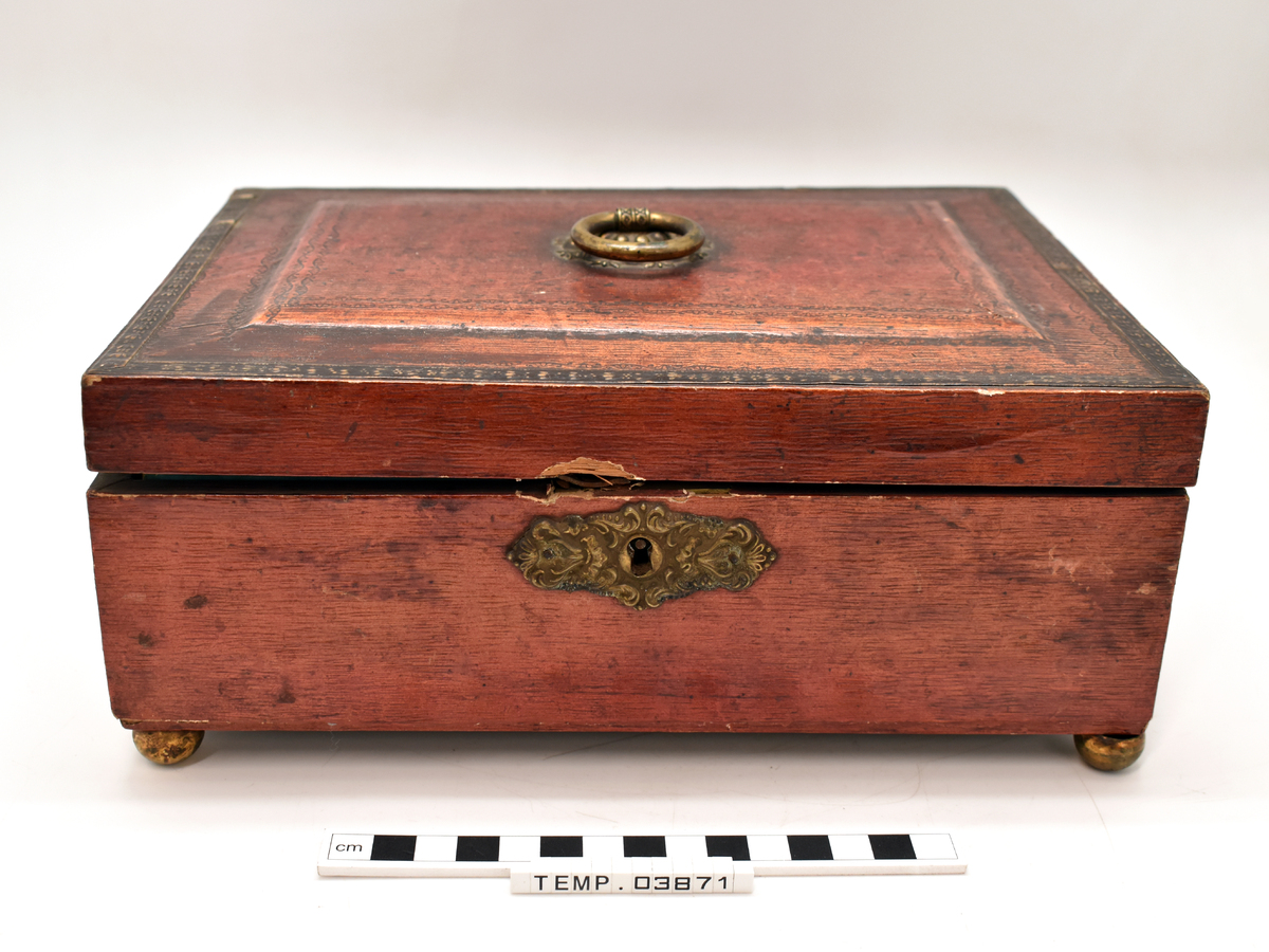 Wooden sewing or jewellery box, mounted on four spherical copper alloy legs, covered in partially faded red paper with floral pattern embossed metal strip decorating the border of the lid. The box is decorated with ornate copper alloy lid handle and an ornamental copper alloy keyhole cover. Insert with separated compartments, one appears to have been covered with paper and silk, possibly forming a pin cushion, but only small fragments of the materials remain visible. Small lid for one compartment decorated in same manner as box lid. The inside of the box is covered in turquoise paper
