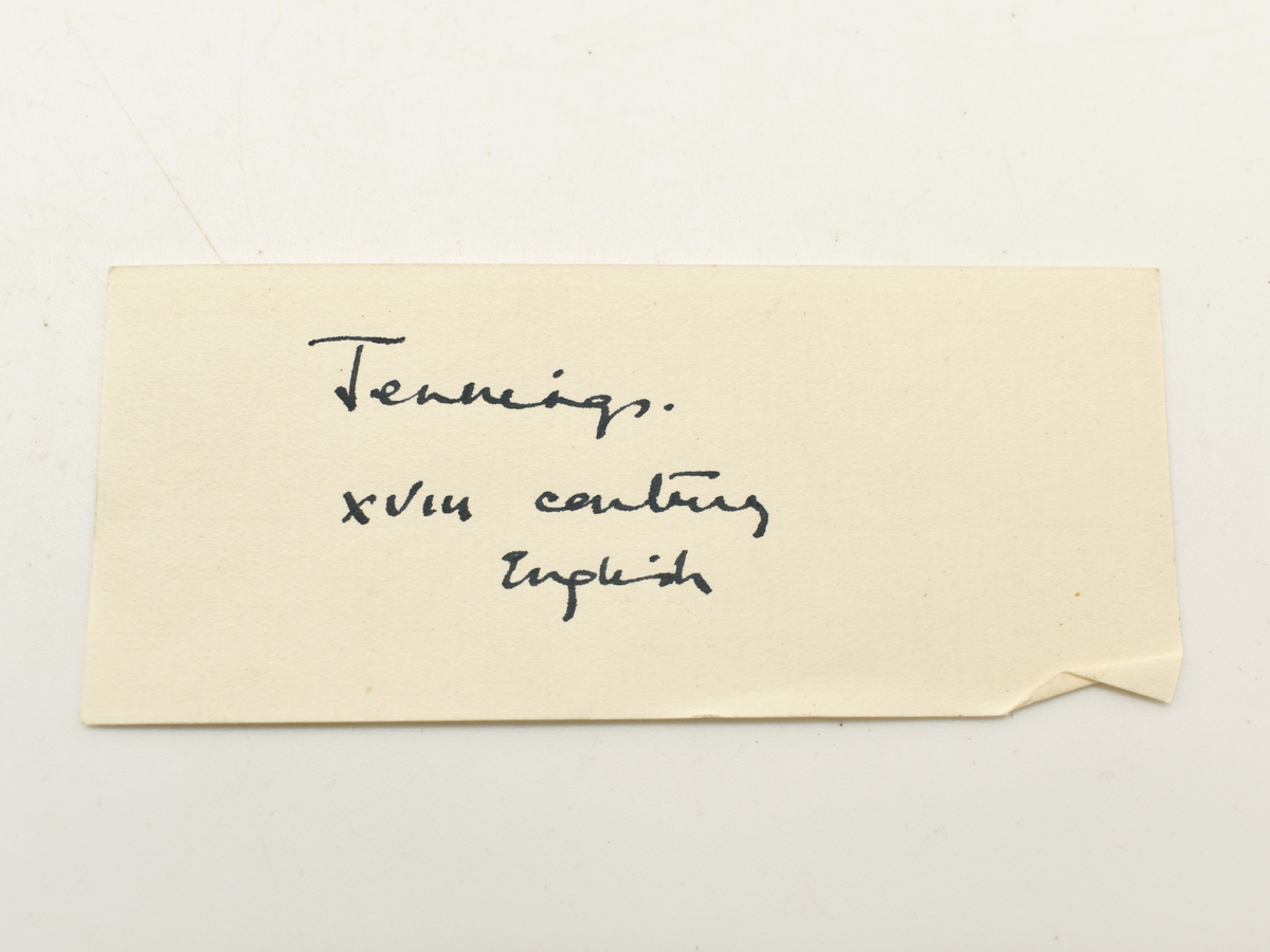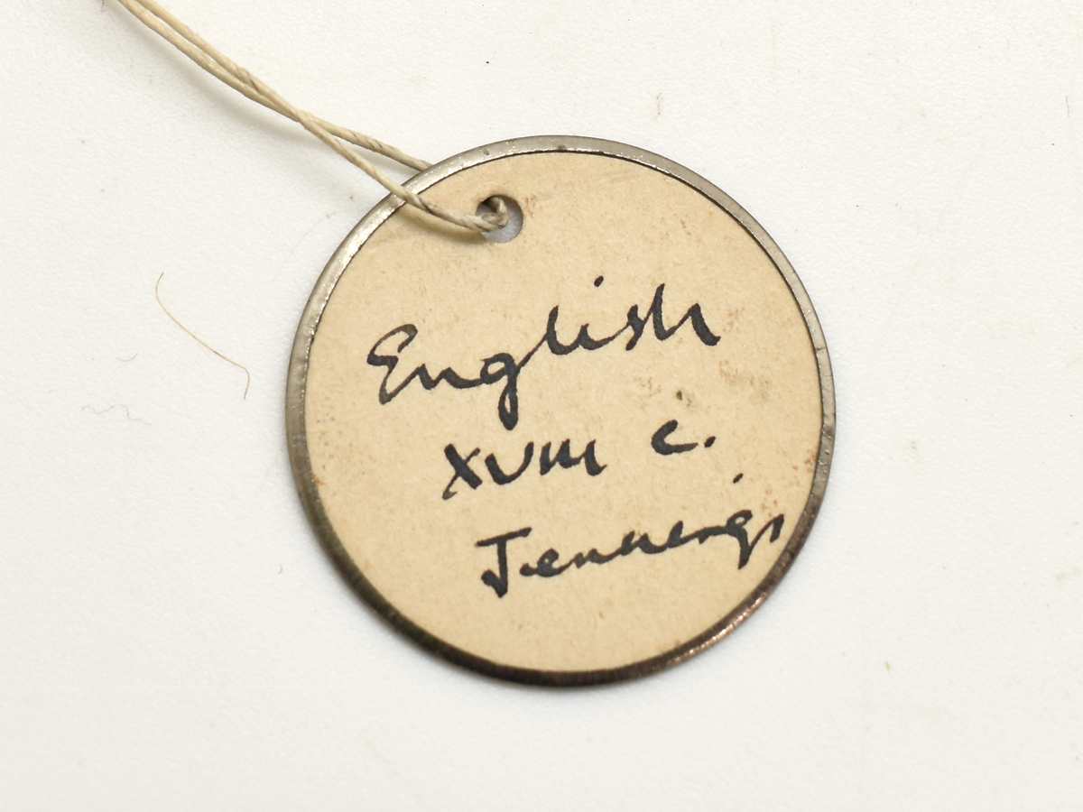 Round object label with metal rim attached to lid handle of TEMP.03871: 'English. XVIII c. Jennings.'