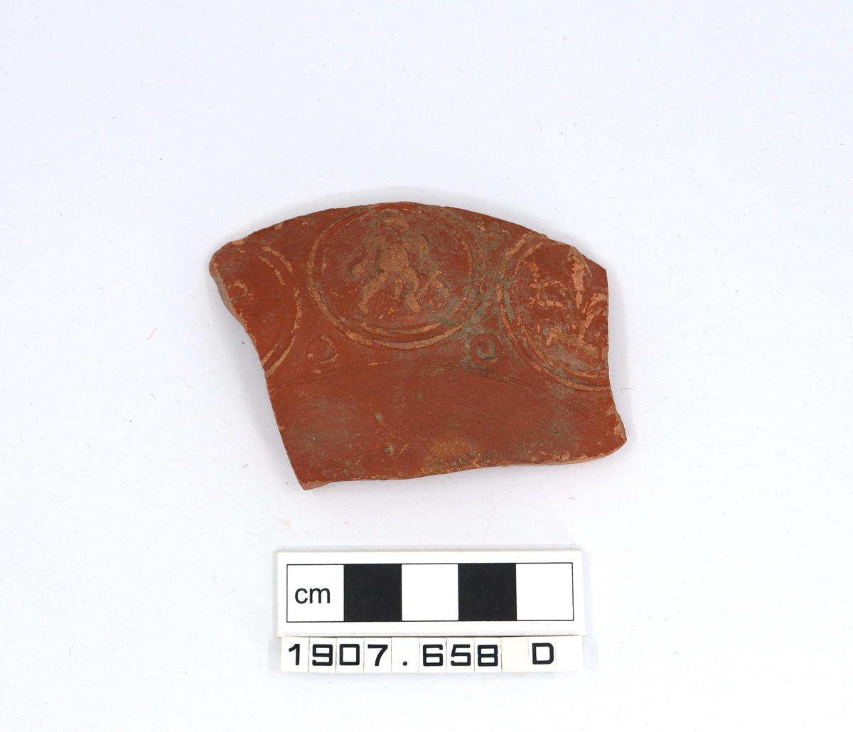 Body sherd of Samian ware decorated with roundels in low relief depicting a human figure and fleur de lys.
