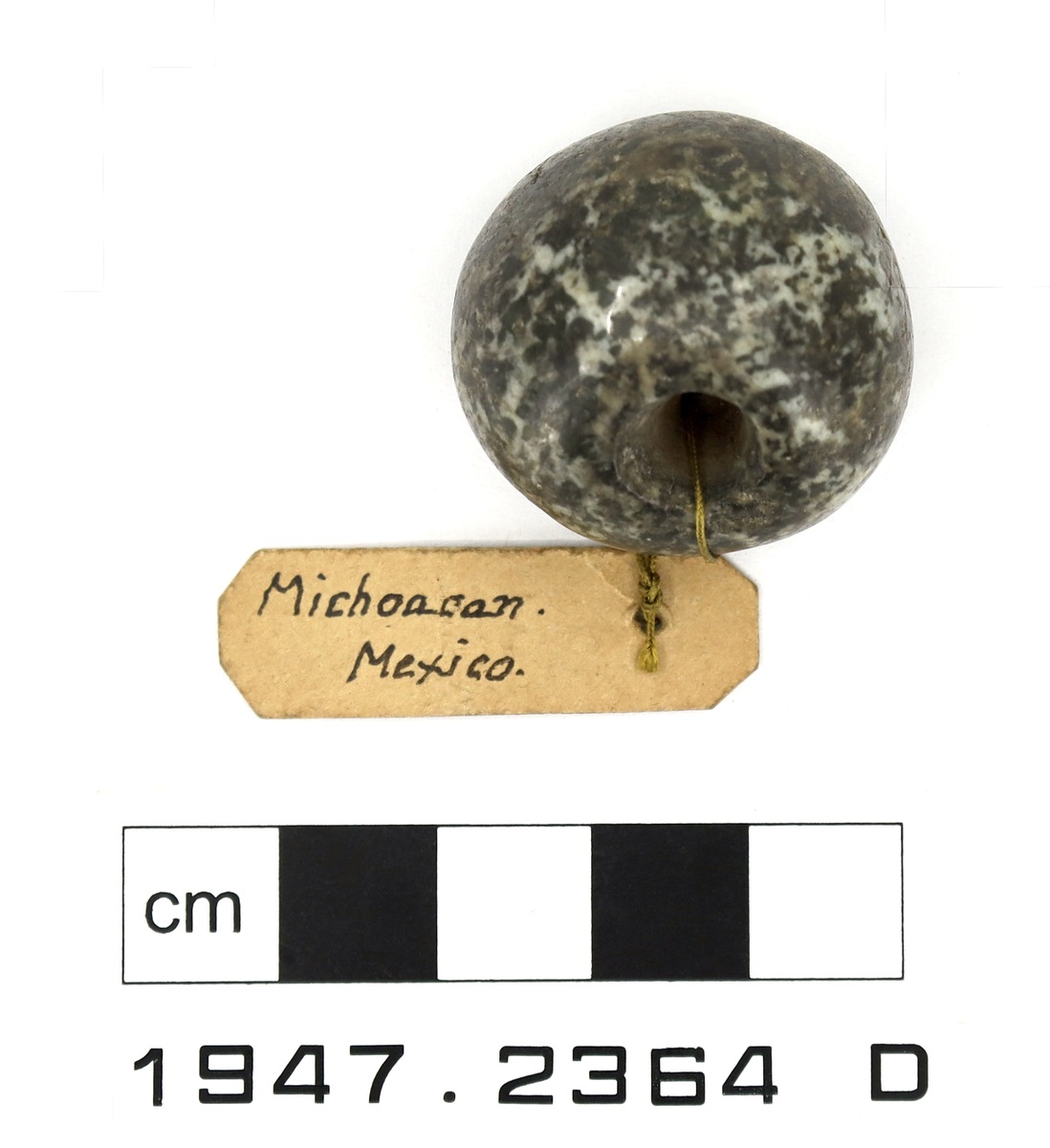 Label attached to bead with a yellow thread reading in black ink: 'Michoacan. Mexico.'.