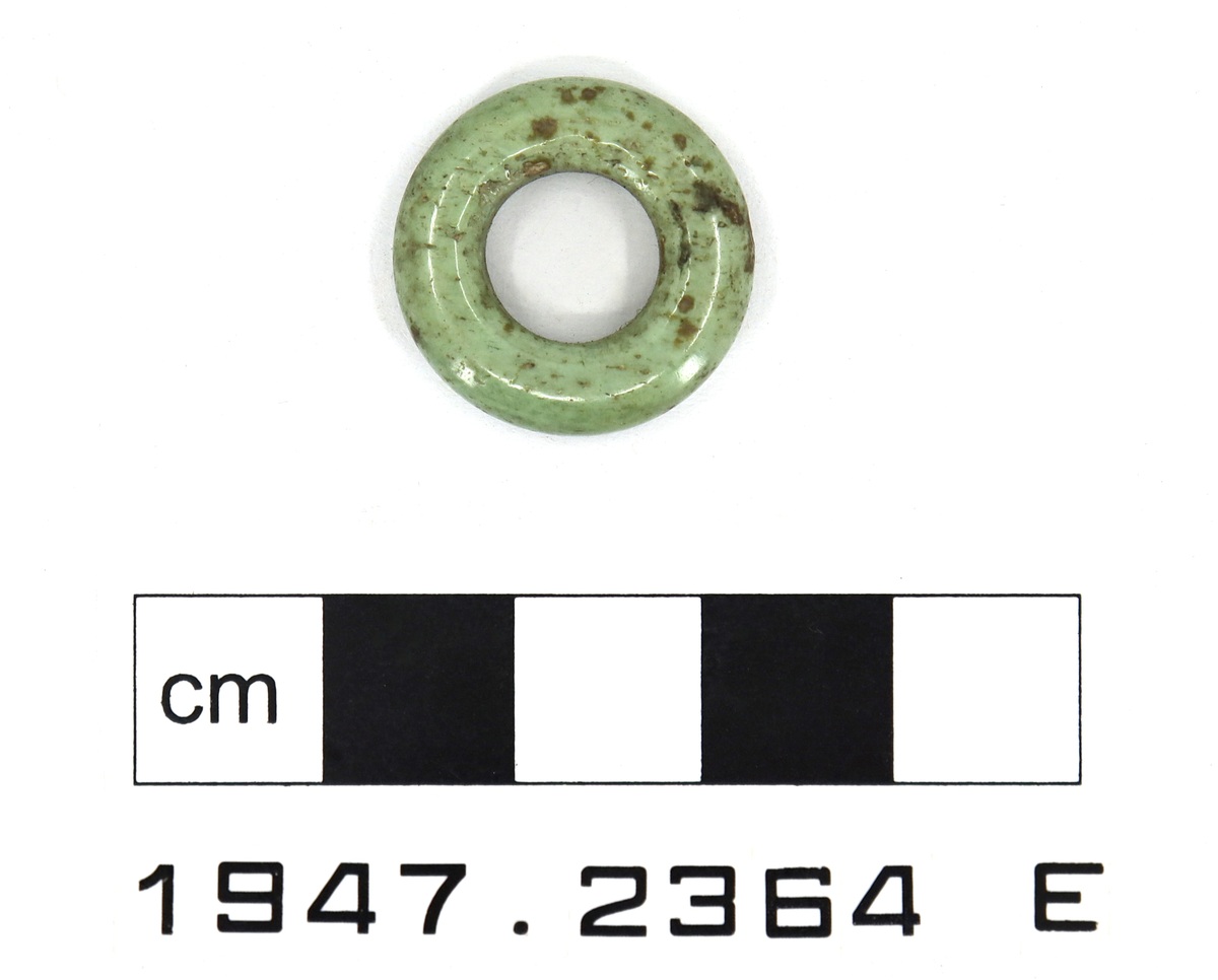 One ring-shaped jadeite bead featuring small brown inclusions. Occasional very minor flat black discolourations on the surface.