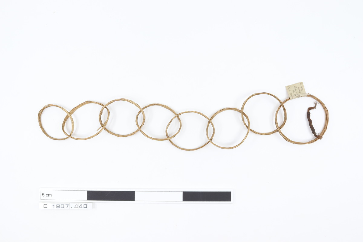 Neck ornament. Eight rings of plaited cane connected together. A short string of (possibly) bark strips as cord on one of the rings.
