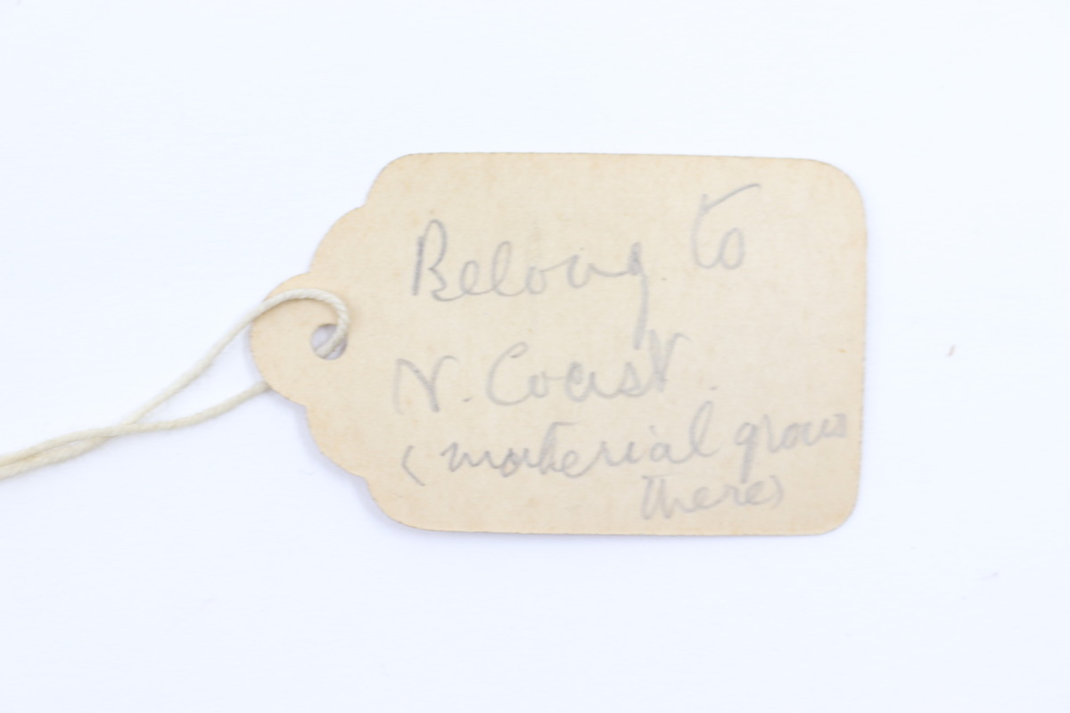 Catalogue card handwritten in blue ink reads, 'Ornament, neck, woman's, rings of plaited cane. / [black ink] diameter 1 1/2" to 2 1/4".'