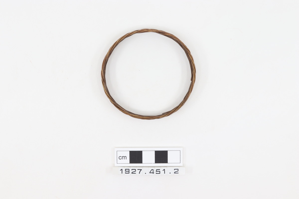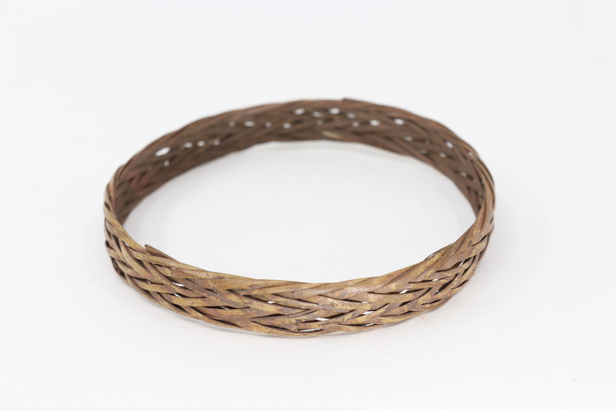 Arm ornament. Finely plaited strips of plant fibre, forming chevron pattern.