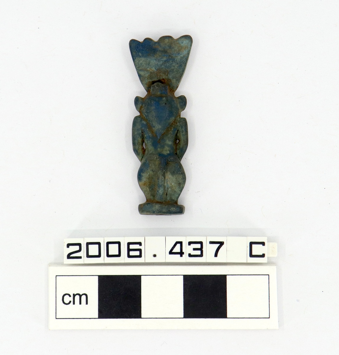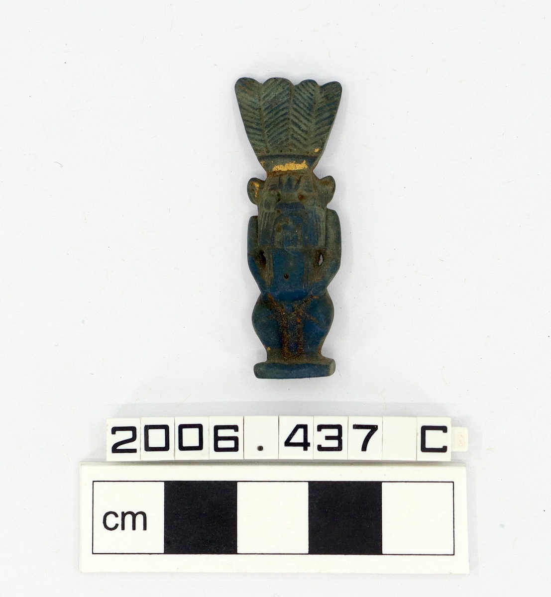 A small, fine, faience amulet figure of Bes, remains of gilding on the headdress and ear. Suspension loop on the back has broken.