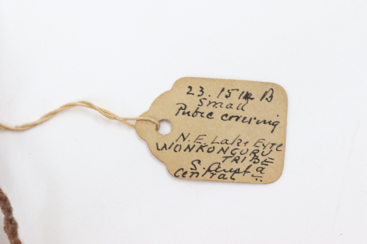 Catalogue card for 1923.1514 A-B, handwritten in black ink reads, 'Small pubic covering - worn more as a decoration than a covering.'