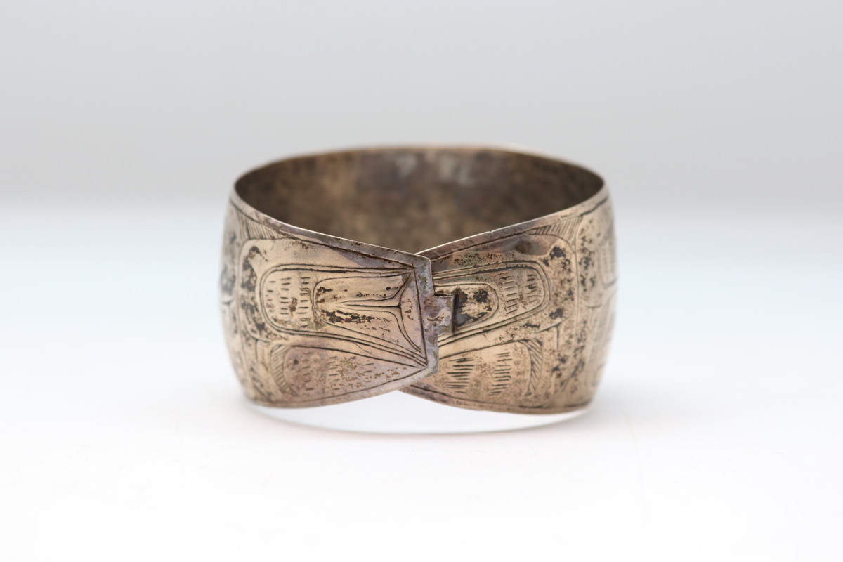The style of carving and shape of these bracelets leads me to suggest they are fairly old, perhaps around 1900. Once silver coins became easily available on the Northwest Coast the carvers transfered their techniques to silver and produced some very fine work. The bracelets were worn at ceremonial events and were distributed as potlatch payments. According to Nancy Harris in The Box of Daylight (Ed. Bill Holm, 1983, University of Washington Press: Seattle and London) page 133-134, the silver jewelry was popular amongst both the indigenous and the settler populations. 'By 1890, every village of any size seemed to have its own resident smith and the best of these made regular pilgrimages to the trade centres of Victoria, Sitka and Fort Simpson to sell their wares.' The silver bracelets have continued to be popular and are still worn in abundance during potlatches and celebrations along the coast. The bracelets are also still a saleable item for the art and tourist market.