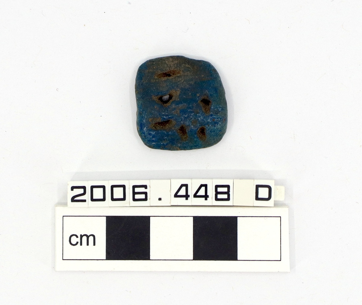 Small open work dark blue faience bead or amulet with possible a wadjet eye design, though poorly defined.