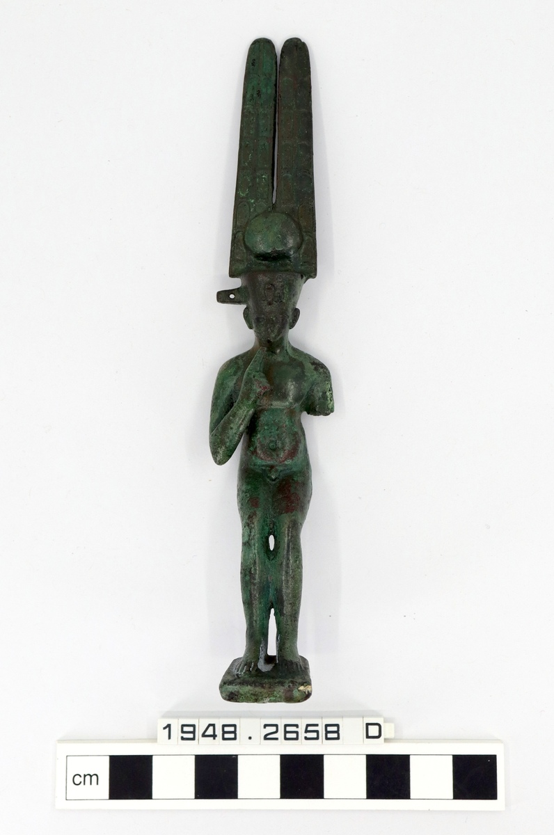 A bronze figure of Harpocrates with very tall plumes. Left arm is missing and there is a protruding perforation where the side lock would have been but is now missing.