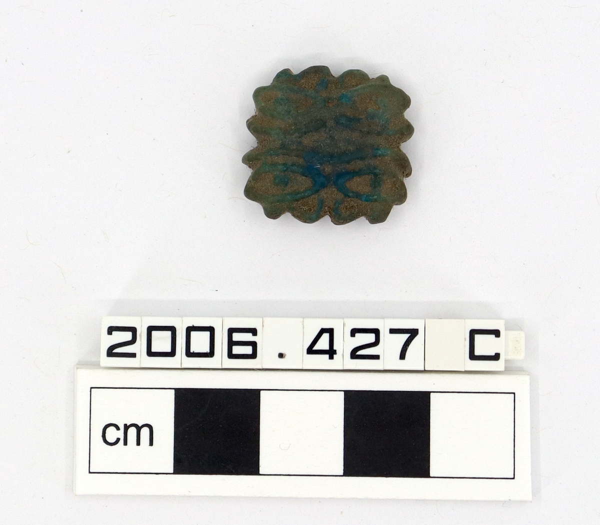 A green-blue faience amulet or bead in the form of a wadjet/wedjat eye or Eye of Horus.