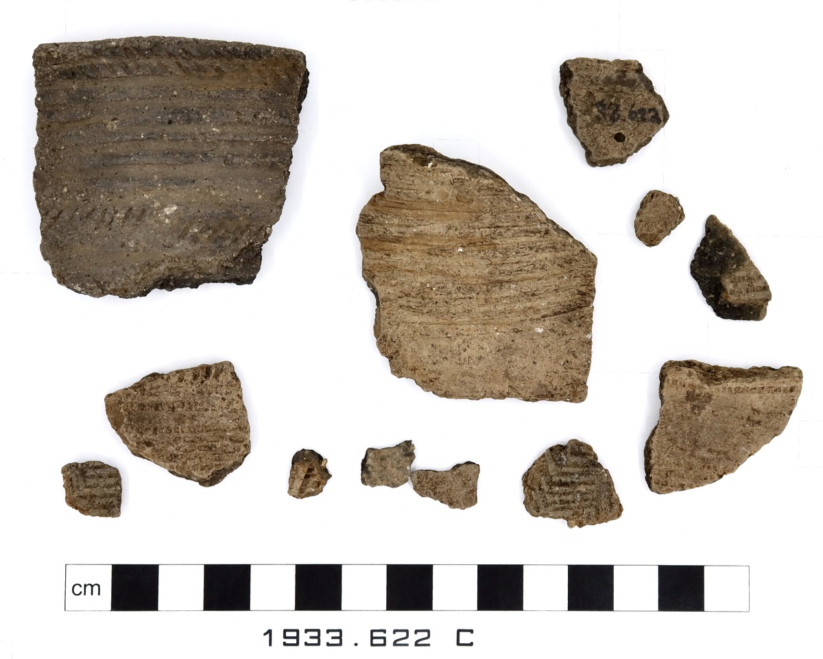 Description for 1933.622 [A-C]: '2 sherds of unusually large beaker. A few sherds of other beakers. 1 unusually large beaker of coarse dark brown gritted ware; 1 sherd of a thick coarse ware. The 2 sherds of the large beaker are elaborately ornamented with rouletted lines, bands of finger nail impressions, and alternating panels of diagonal groups of rouletted lines, and vertical rows of impressed concentric circles. The other sherds are ornamented with rough loop-shaped impressions.'