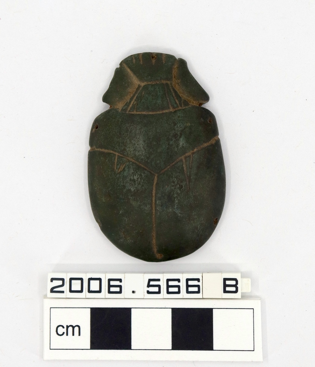 A large scarab, possibly of glazed stone or faience, with holes around the edge for attaching to a mummy. Body only, no wings. The underside is uninscribed and the decoration on the top is simple.