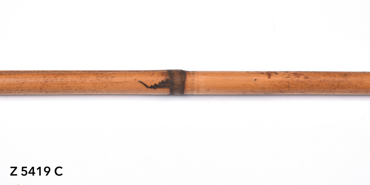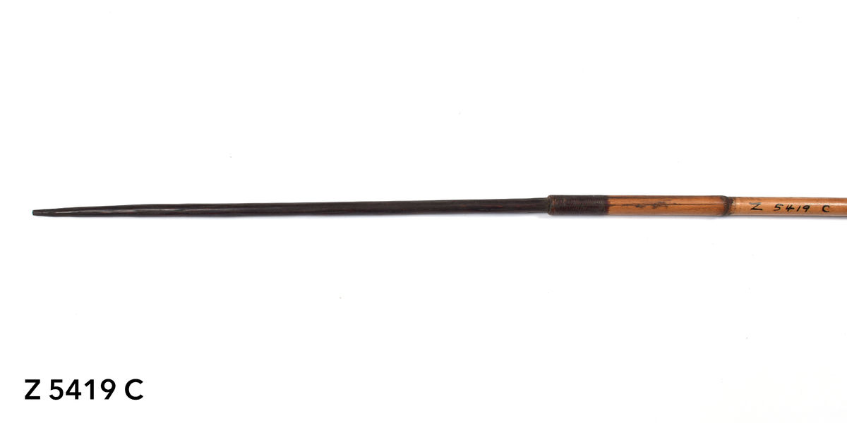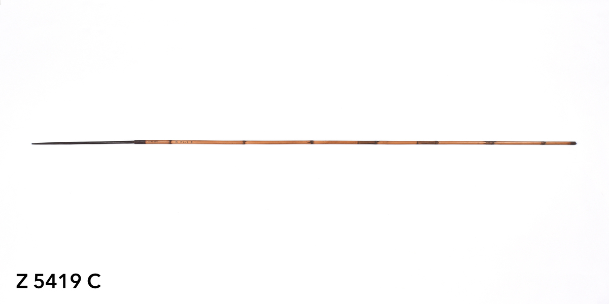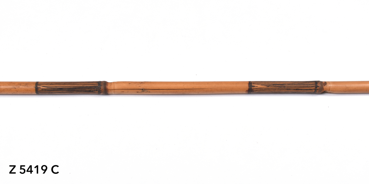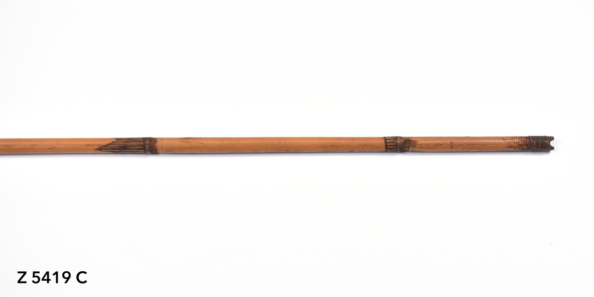 Arrow. Tapering point of palm wood. The tip is bound with yellow orchid fibre. The point is inserted into a bamboo shaft (no binding). The central part of the shaft is incised with a triangular pattern repeated twice. The lower part of the shaft shows five panels incised with longitudinal lines. The transition to the butt is bound with plant fibre covered in dark gum or resin. The butt is carved with a nock.
