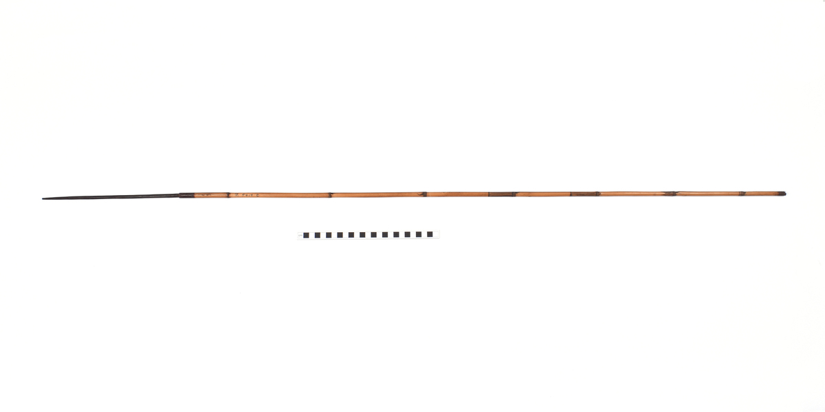 Arrow. Tapering point of palm wood. The tip is broken. The point is inserted into a bamboo shaft and bound in place with plant fibre covered in dark gum or resin. The central part of the shaft is incised with a triangular pattern repeated three times. The lower part of the shaft shows four panels incised with longitudinal lines. The transition to the butt is bound with plant fibre covered in dark gum or resin. The butt is carved with a nock.