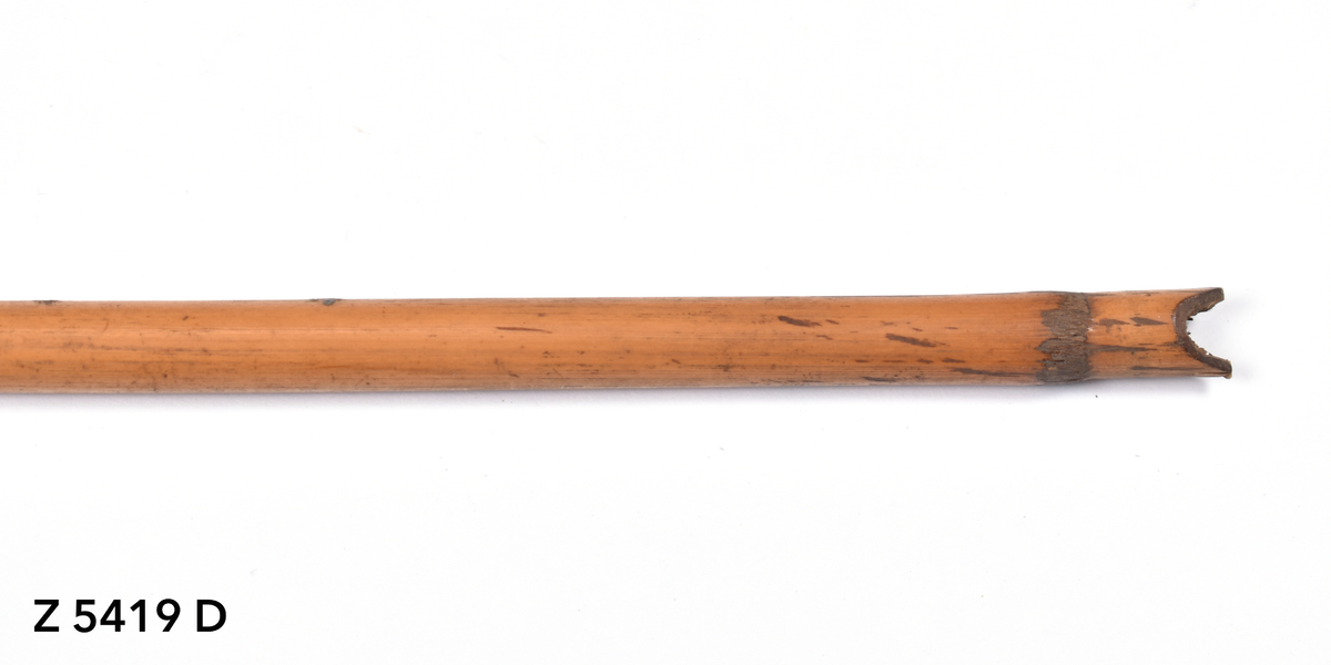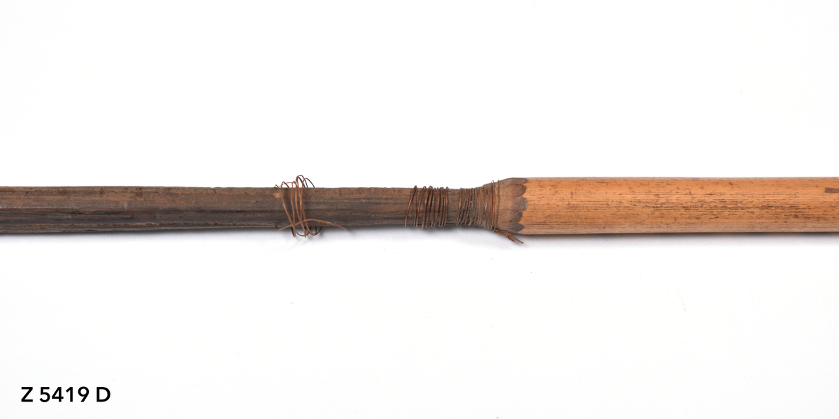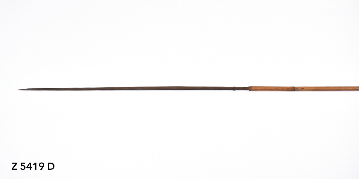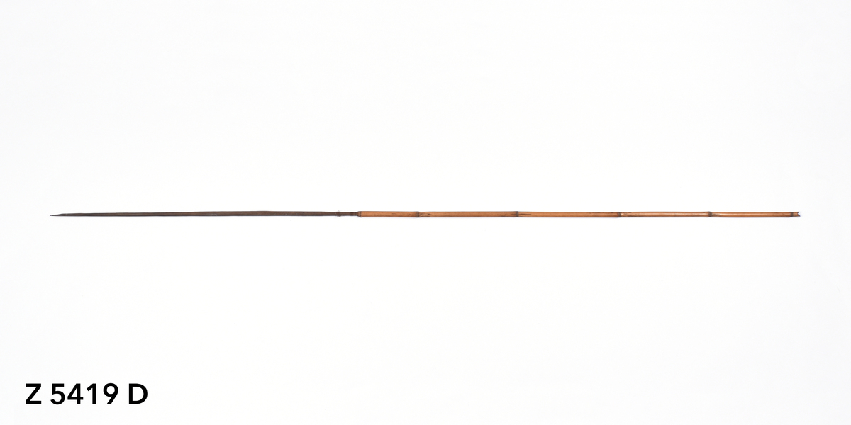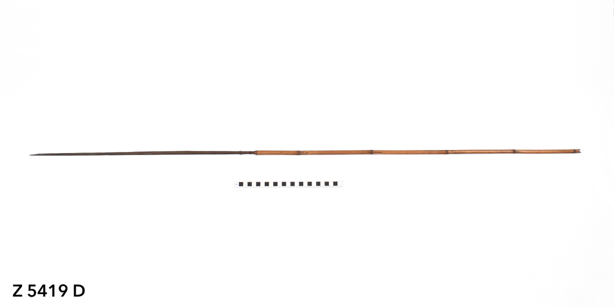 Arrow. Tapering point of palm wood. The tip is broken. The point is inserted into a bamboo shaft and bound in place with plant fibre (now unravelling). Plain bamboo shaft. The butt is carved with a nock.