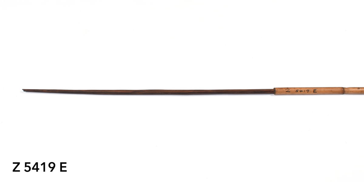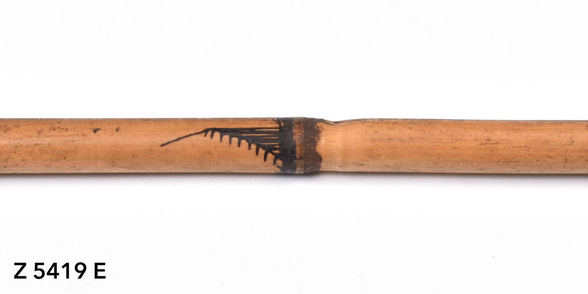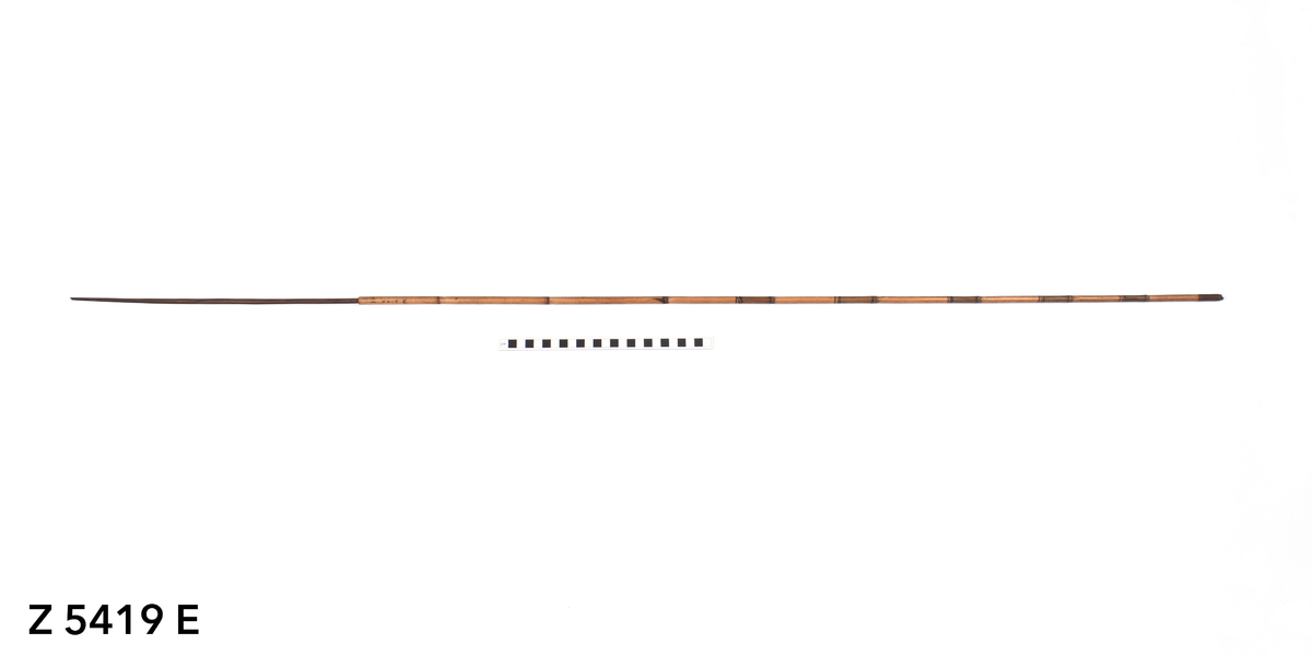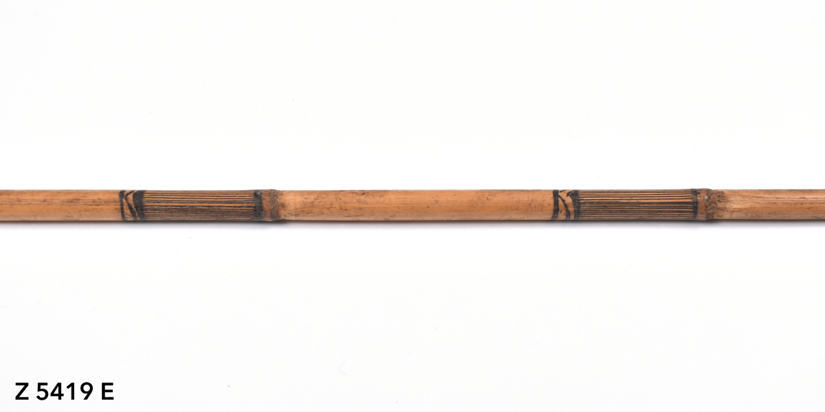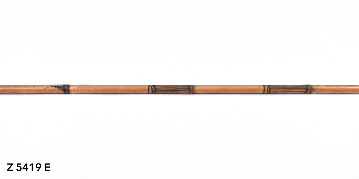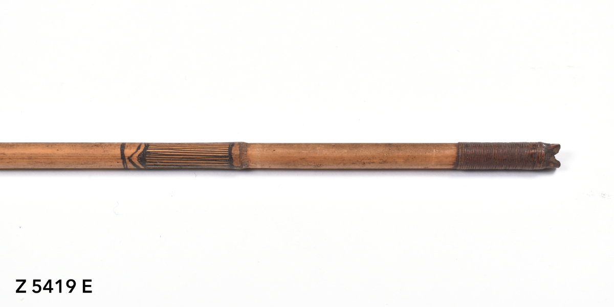 Arrow. Tapering point of palm wood. The tip is broken. The point is inserted into a bamboo shaft (no binding). The central part of the shaft is incised with a triangular pattern repeated twice. The lower part of the shaft shows five panels incised with longitudinal lines. The transition to the butt is bound with plant fibre covered in dark gum or resin. The butt is carved with a nock.