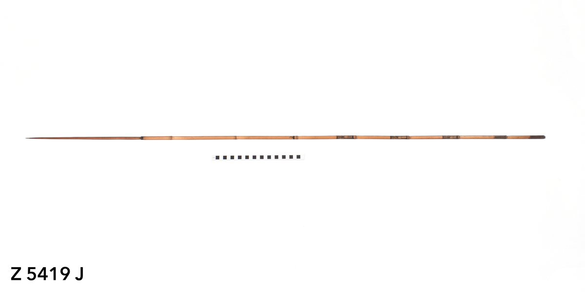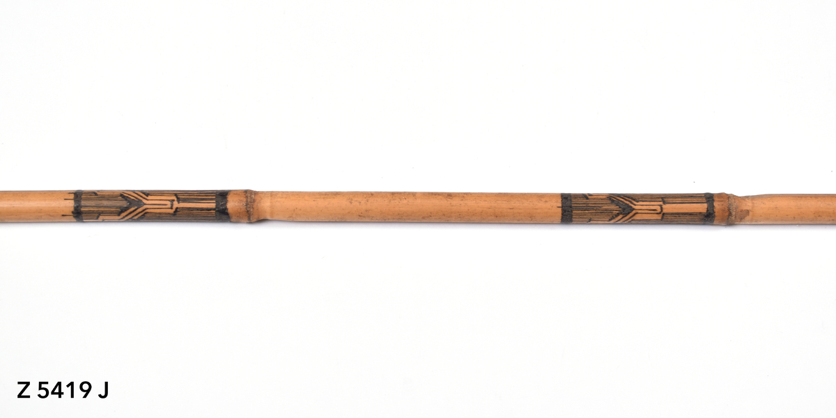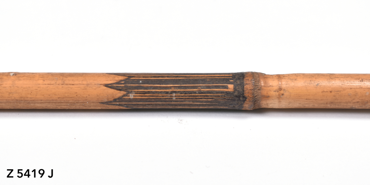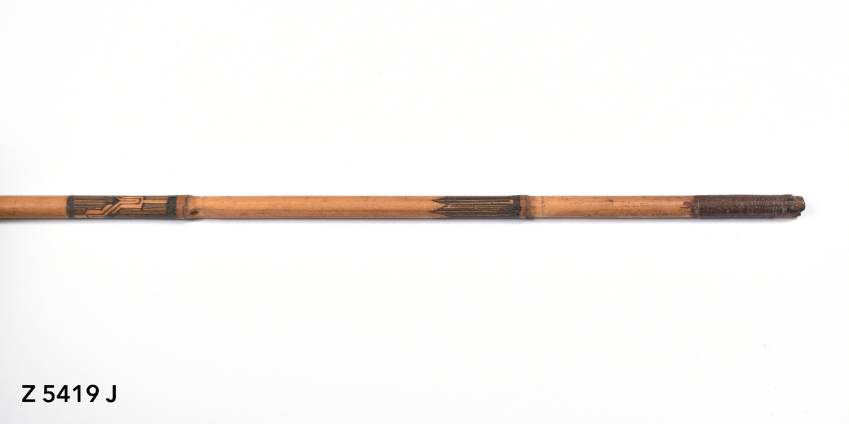 Arrow. Tapering point of palm wood. The tip is bound with yellow orchid fibre. The point is inserted into a bamboo shaft and bound in place with plant fibre covered in dark/red gum or resin. The central part of the shaft is incised with a triangular pattern repeated three times. The lower part of the shaft shows four panels incised with longitudinal lines. The transition to the butt is bound with plant fibre covered in dark gum or resin. The butt is carved with a nock.