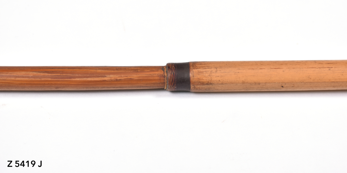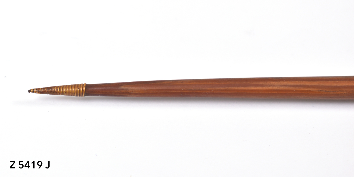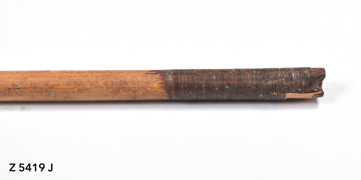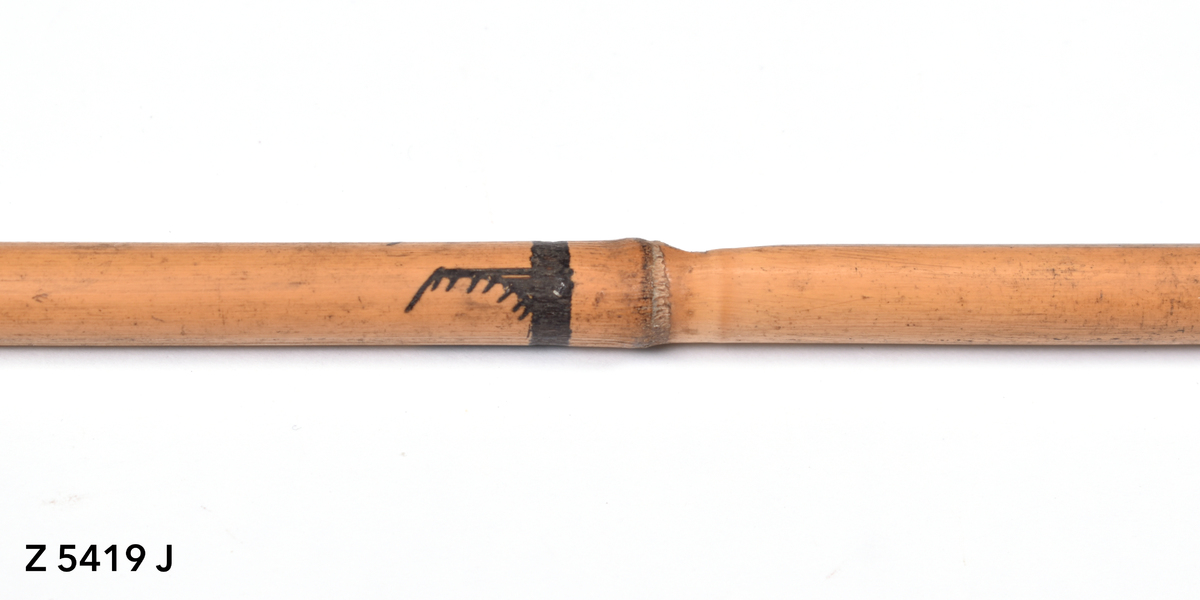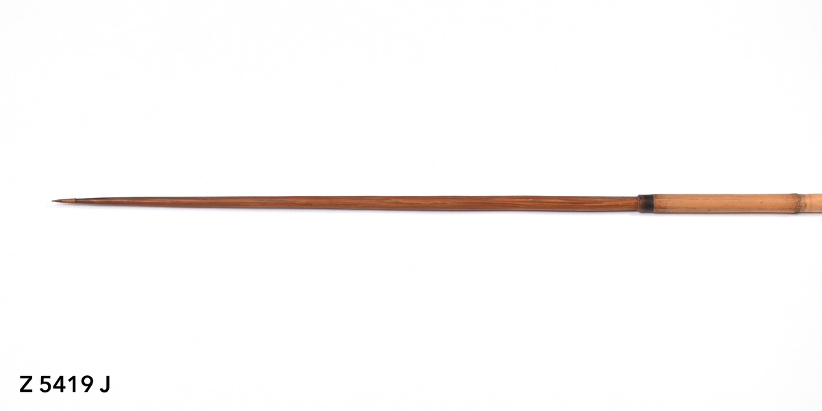 Arrow. Tapering point of palm wood. The tip is bound with yellow orchid fibre. The point is inserted into a bamboo shaft and bound in place with plant fibre covered in dark/red gum or resin. The central part of the shaft is incised with a triangular pattern repeated three times. The lower part of the shaft shows four panels incised with longitudinal lines. The transition to the butt is bound with plant fibre covered in dark gum or resin. The butt is carved with a nock.
