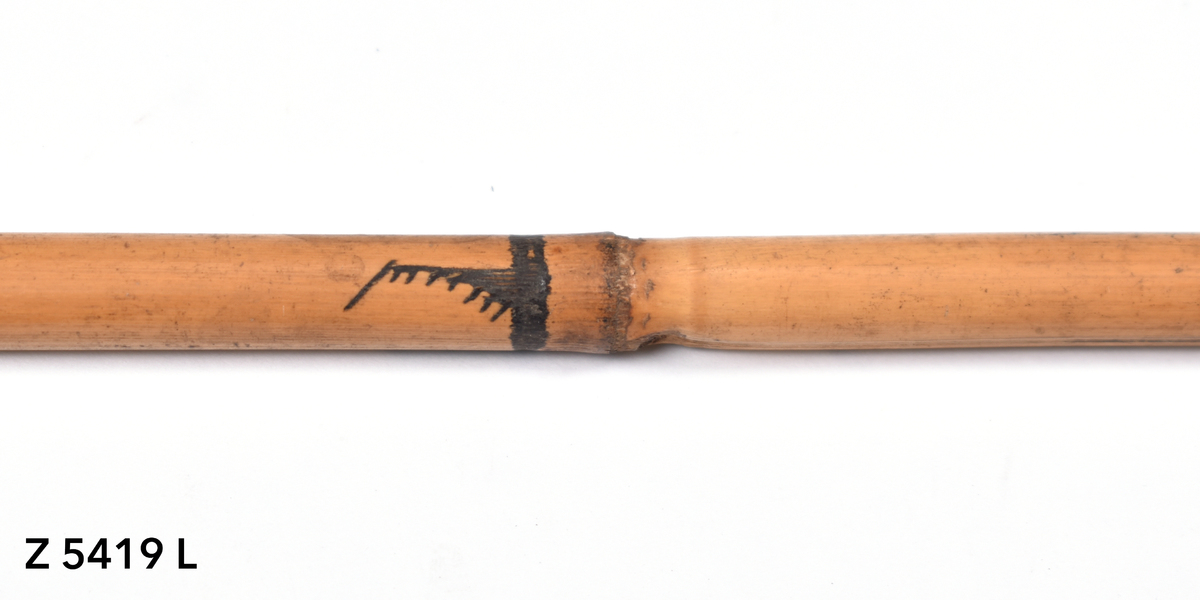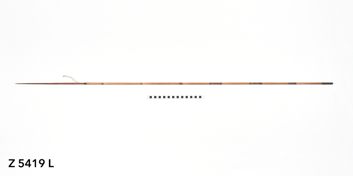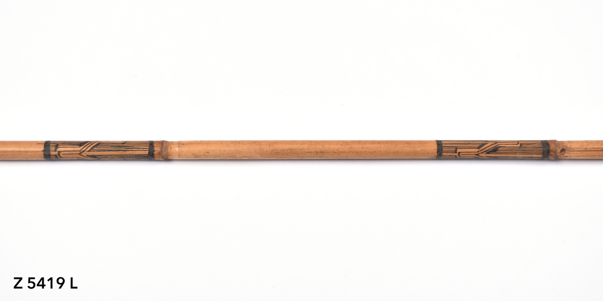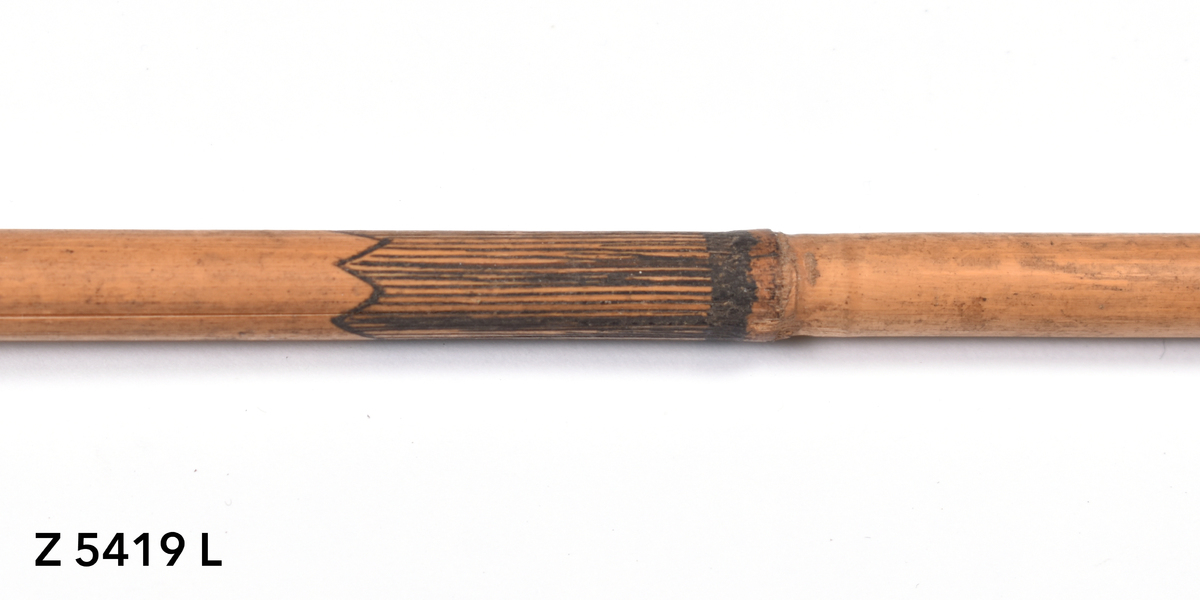 Arrow. Tapering point of palm wood. yellow orchid fibre binding around tip. Point inserted into bamboo shaft, secured with plant fibre binding covered in dark gum or resin. Shaft has three sections of incised black lines. Section nearest point is decorated with a triangular pattern repeated three times. Lower part of shaft bound with plant fibre covered in dark gum or resin. Butt carved with a nock.