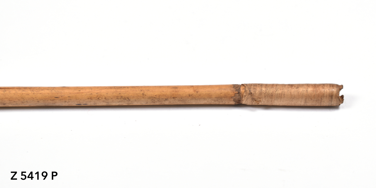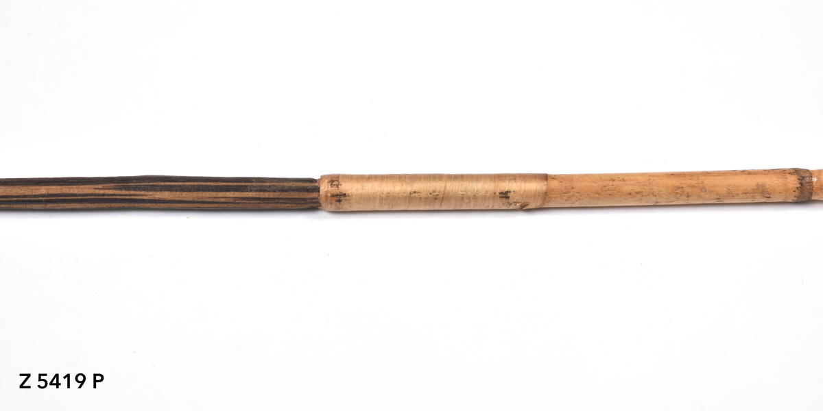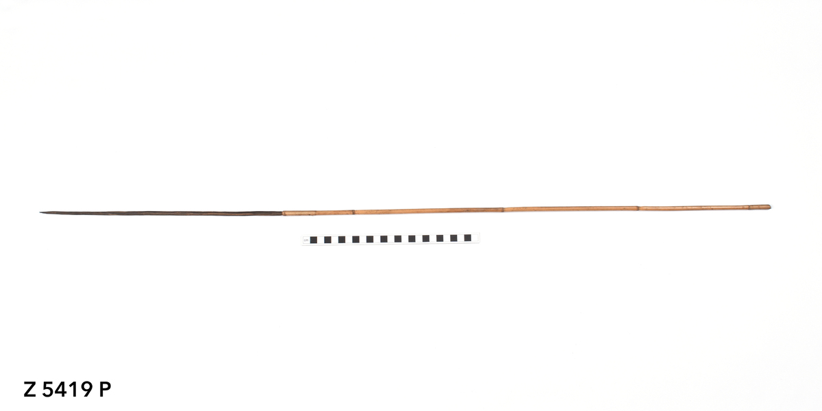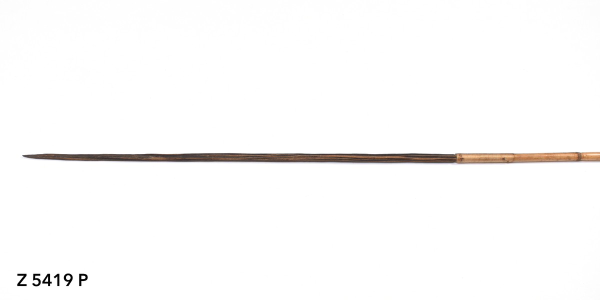 Arrow. Tapering point of palm wood. Point inserted into bamboo shaft, secured with plant fibre binding (possibly banana). Plain shaft. Lower part of shaft bound with plant fibre (banana). Butt carved with a now damaged nock.