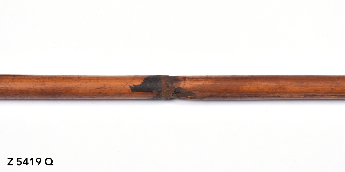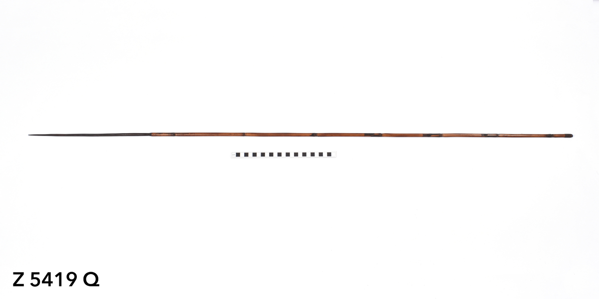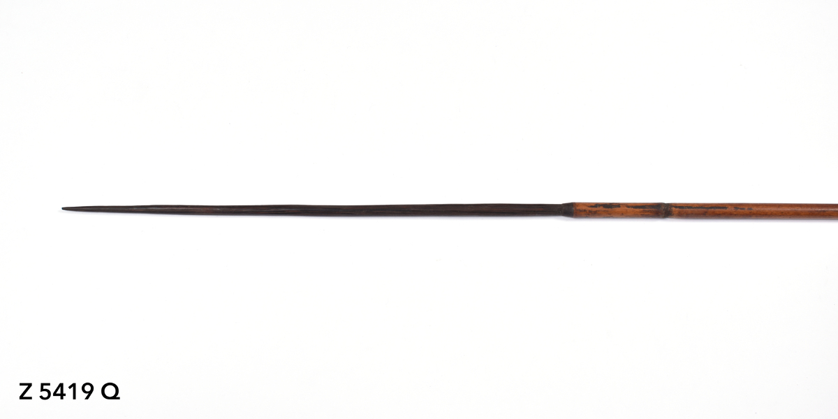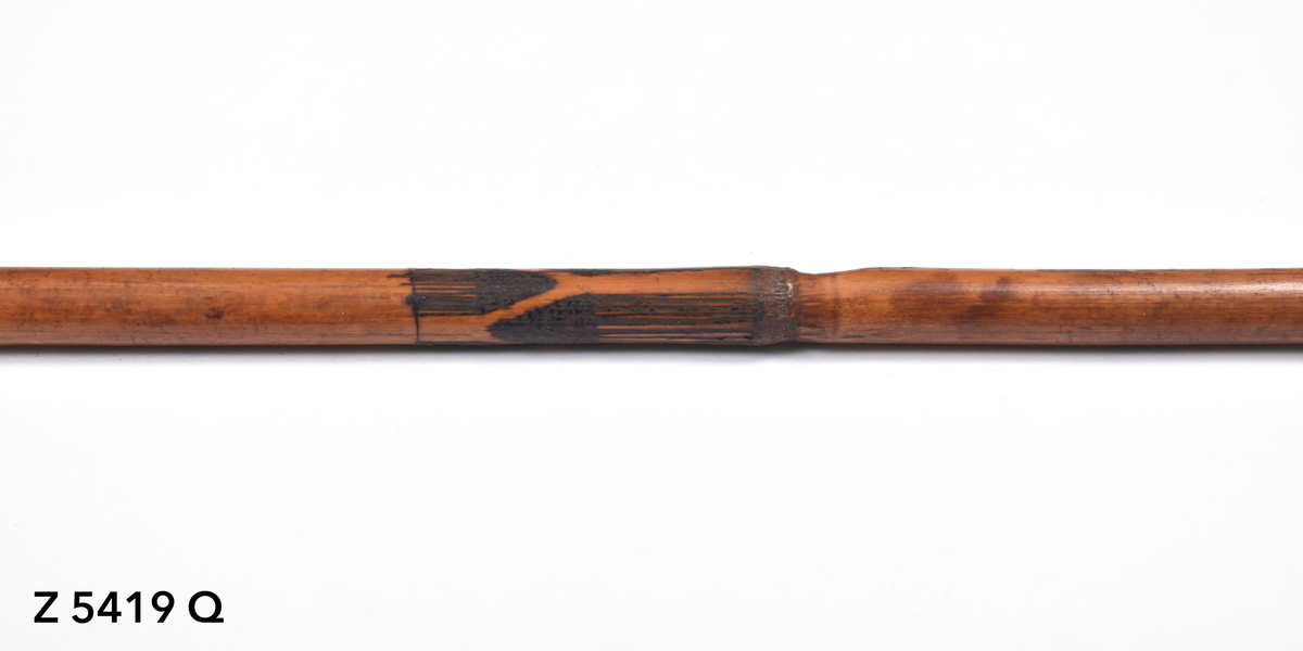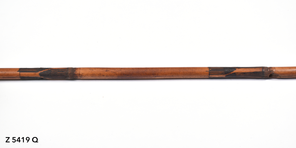 Arrow. Tapering point of palm wood. Point inserted into bamboo shaft, secured with plant fibre binding covered in dark gum or resin. Shaft has four sections of incised black lines. Section nearest point is decorated with a triangular pattern repeated three times. Lower part of shaft bound with plant fibre covered in dark gum or resin. Butt carved with a nock.