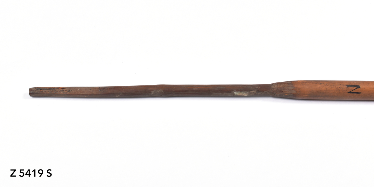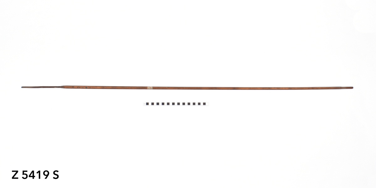 Arrow. Tapering point of palm wood with flat tip. Point inserted into thick bamboo shaft. Plain shaft darkened with red pigments. Flat butt.