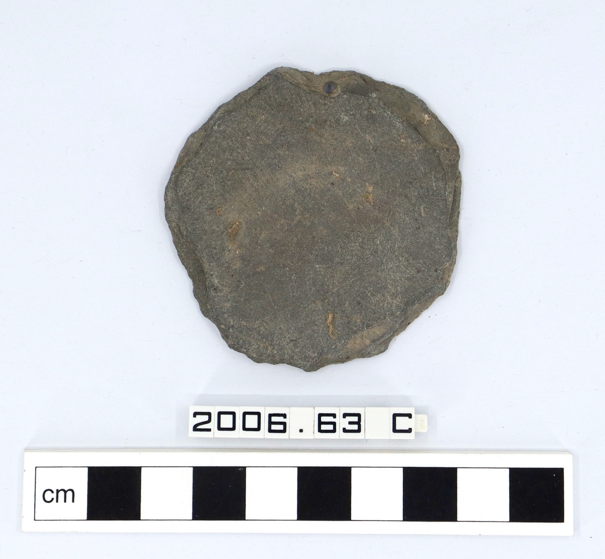A flat, circular schist object with a small perforation at the edge for possible suspension a hinge point if affixed to something.