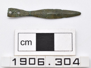 Miniature leaf-shaped copper alloy spearhead pendant, with …