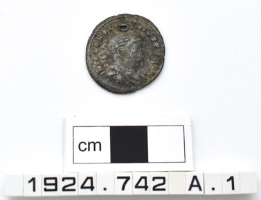 Copper alloy coin of Constantine I. Obverse with laureate p…