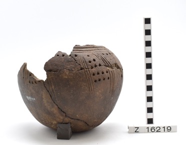 Incomplete globular pot with flat base. Decorated with long…
