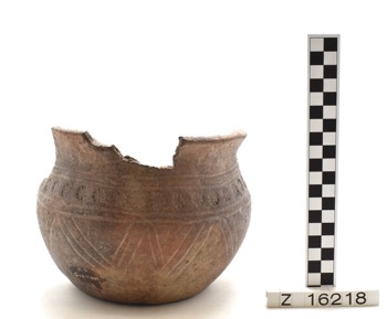 Incomplete pot with everted rim and flat base. Decorated wi…