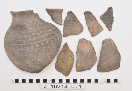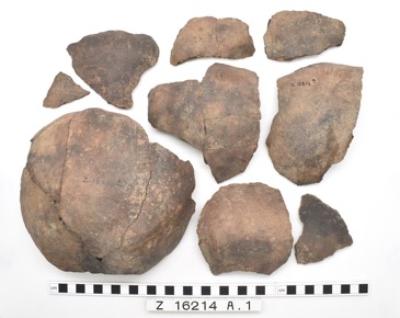 19 sherds from a globular pot with high everted rim. Mostly…