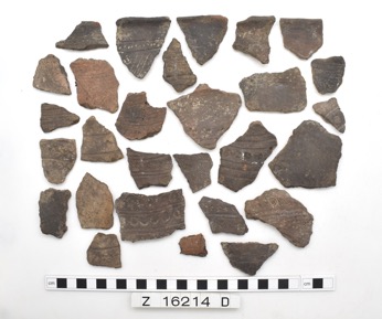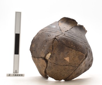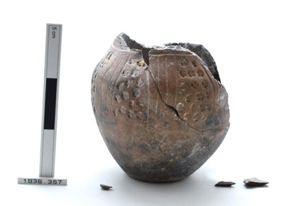 Shouldered urn with flat base; reconstructed. Below neck ar…