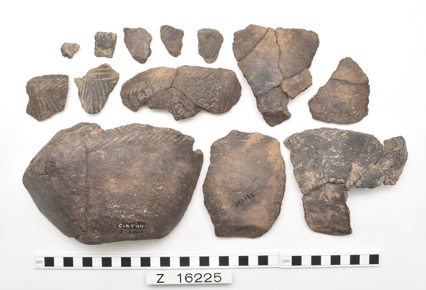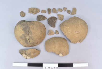 Two large and 16 smaller sherd from a pot with a flat base.…