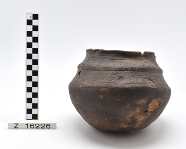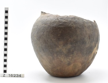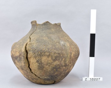Undecorated pot with an everted rim and wide mouth, and a f…