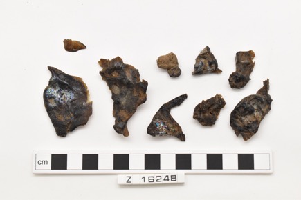 Eight fragments of melted thin brown glass and one piece of…