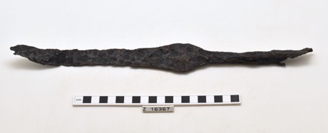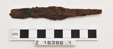 Iron knife with thin broken tang and symmetrical blade; tip…